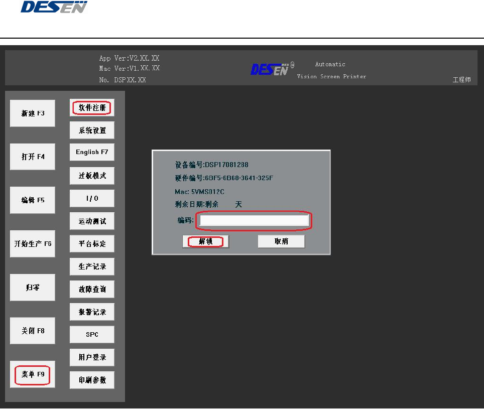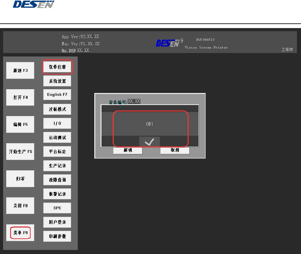 深圳德森精密设备有限公司 第四章 操作系统说明 45 第四章 手动升级 说明 (图 13-2) 点击解锁后 ,会看到授权 以下信息( 图 14 ) !