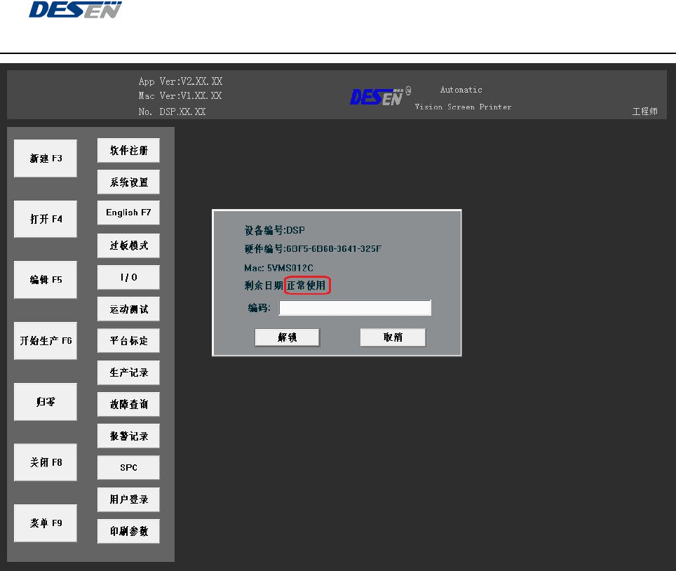 深圳德森精密设备有限公司 第四章 操作系统说明 46 (图 14) 4.3.2 授权程序升级过程 窗口状态信 息“正常使用 ” ,看到授权 成功后 信息以下窗口 (图 15 ) !