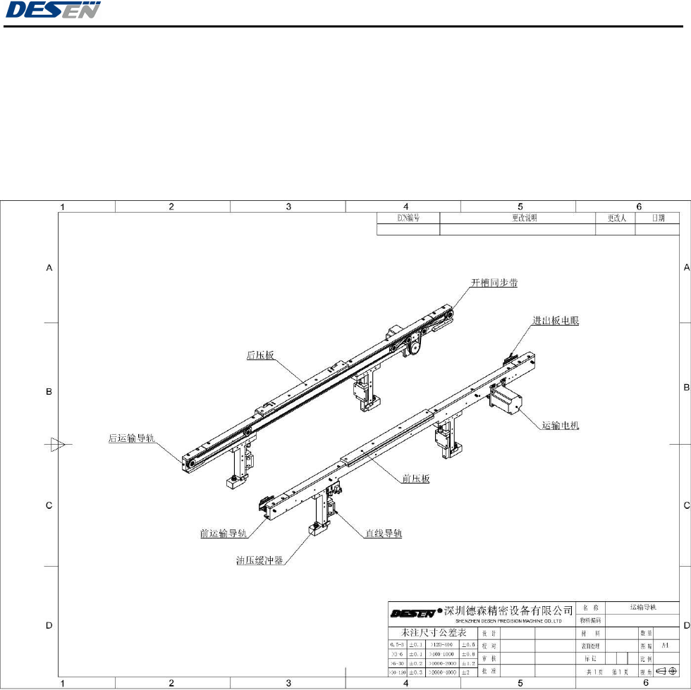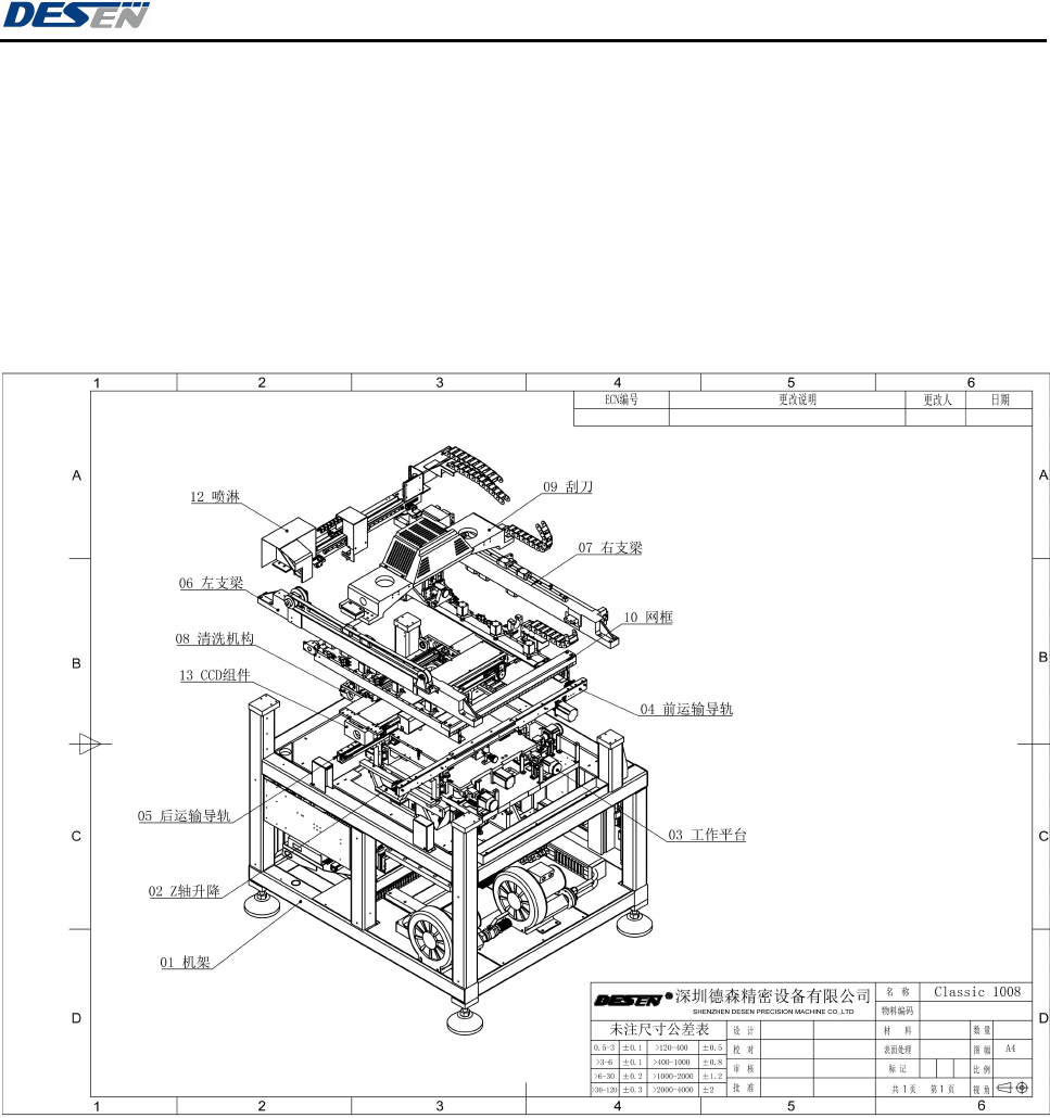 深圳德森精密设备有限公司 第一章 系统描述 5 1.4 系统 的主要组 成部 分 本机包括机械、电气两大部分。 机械部分由运输系统、网板夹持装置、 PCB 夹板装置、视觉系统、 刮刀系统、自动网板 清洗装置、可调工作平台等组成。 电气部分由工 控机及控制 软件、驱动器、 步进电机、 伺服电机和气动 系统以及 信号监测 系统组成。 图 1-2 结构图