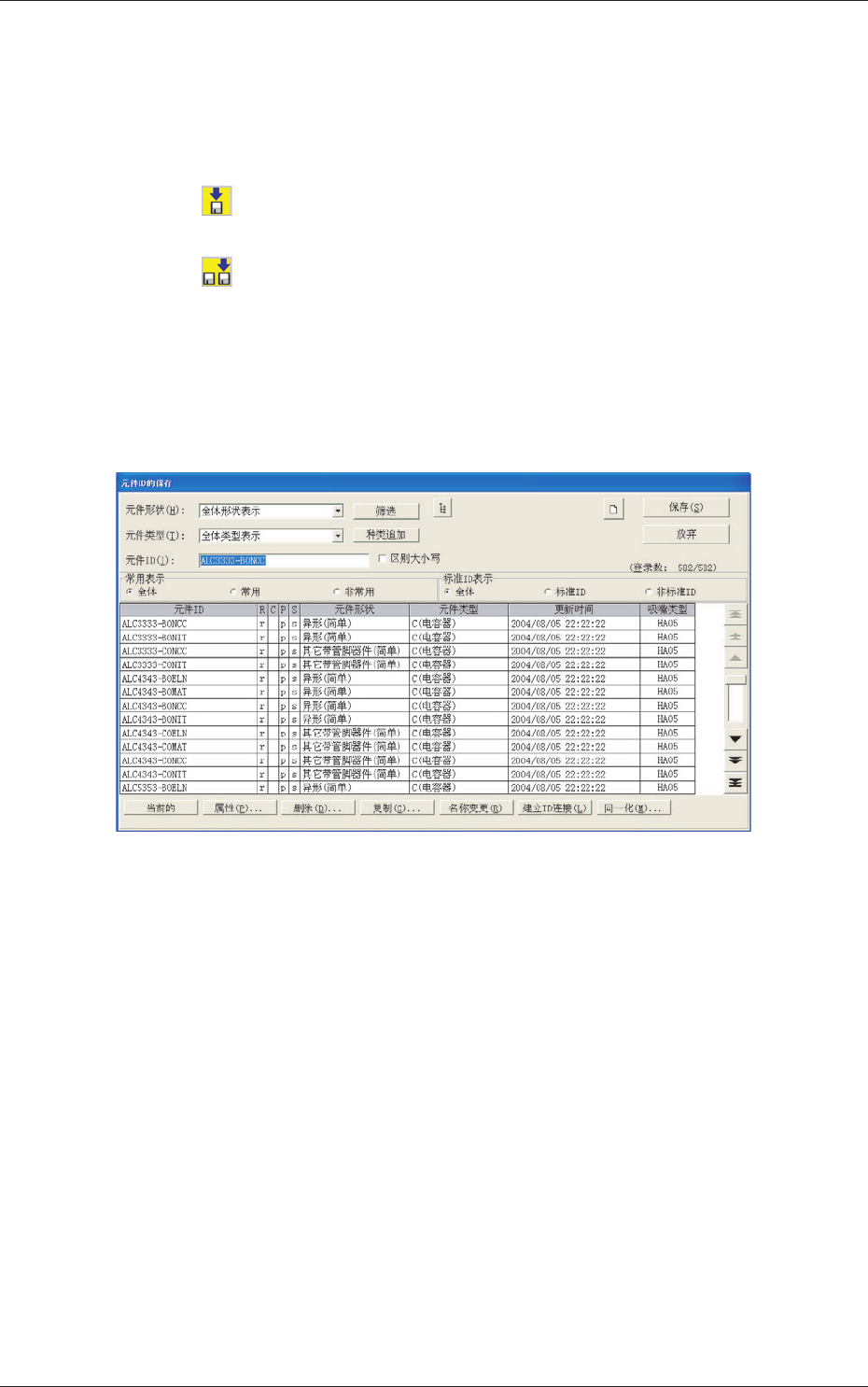 4 - 15 0805 - 002 2.2 元件 ID 的保存 2.2 元件 ID 的保存 说明如何保存新建或编辑后的元件 ID。 (1) 按工具栏的 “ 保存 ” 图标。 : 保存 将编辑后的元件 ID 覆盖到原来元件 ID 时选择。 : 另存为 新建文件时和编辑后用新的元件 ID 保存时选择。 (2) 按 [ 保存 (S)] 图标,编辑界面中显示的元件数据库覆盖保存为 当前的元件 ID 名。 (3) 按 [ 另存为 ] 图标,显示以…