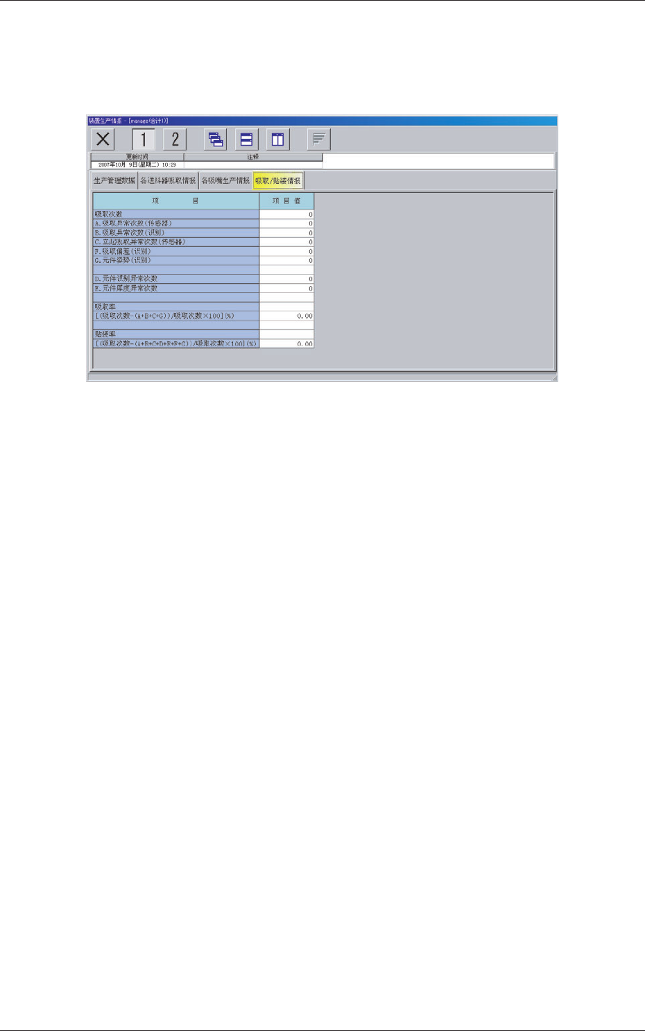 5 - 19 ( ) (2) 吸取率 [( 吸取次数 − (A+B+C+G))/ 吸取次数 × 100](%) 用以下公式算出所得值 ( % )。 吸取次数 − ( A 的次数 + B 的次数 + C 的次数 + G 的次数 ) × 100 吸取次数 (3) 贴装率 [( 吸取次数 − (A + B + C + D + E + F + G))/ 吸取次数 × 100] (% ) 用以下公式算出所得值 ( % )。 A 的次数 + B 的…