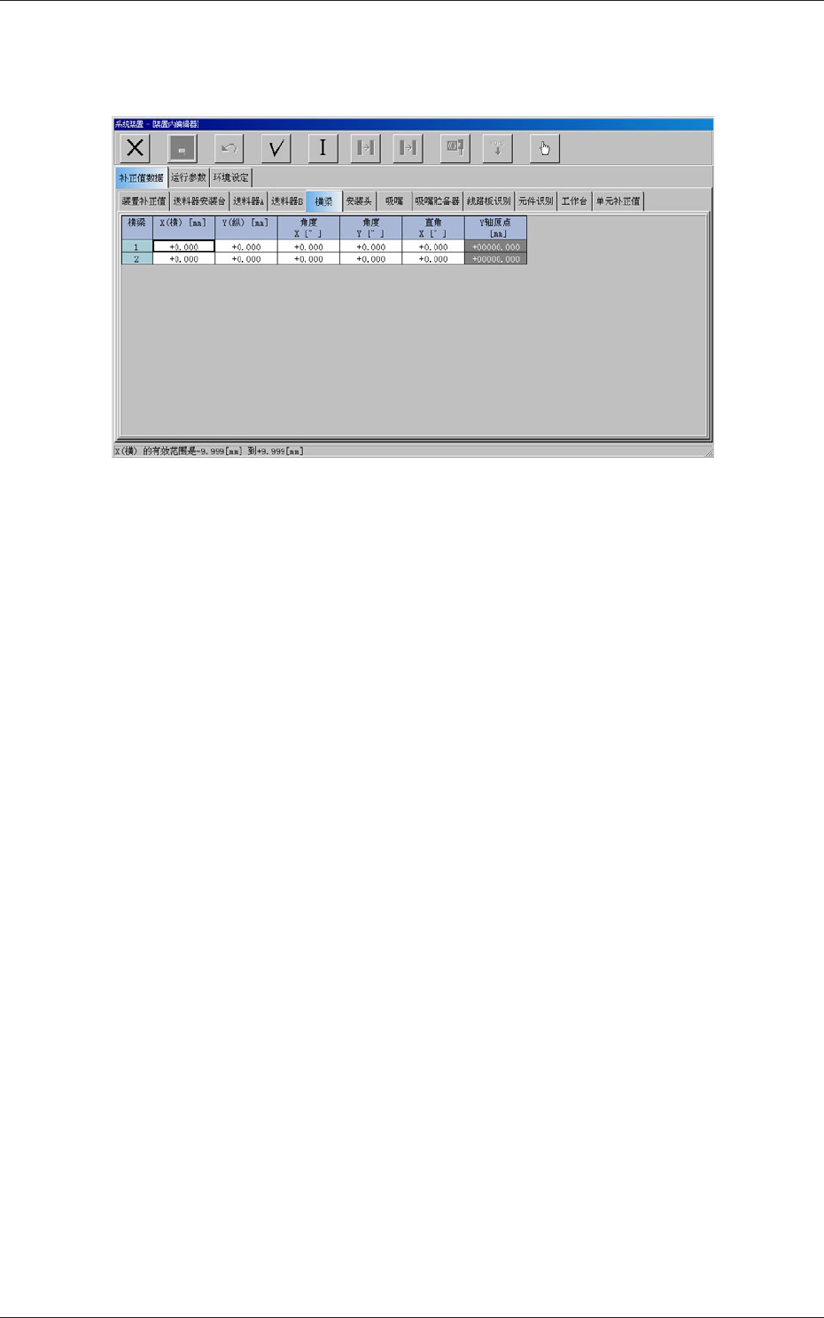 6 - 17 0710 - 001 2.1 补正值数据 [1] X( 横 )、Y( 纵 )[mm] 调整从装置基准坐标系原点和安装头原点位置到线路板识别照相 机中心的设计尺寸的位置偏离的数据。 [2] 角度 X、角度 Y[ ° ] 将横梁 X 及 Y 轴对准装置基准坐标系的数据。 Xm(+) Ym(+) Yb(+) Xb(+) Yb(+) Xb(+) Fig.3F13 Note 以装置基准坐标系为基准实际横梁坐标系往逆时针方向倾斜时,横…