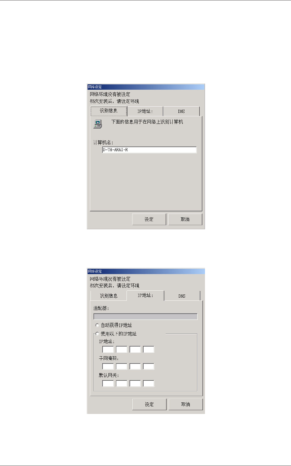 6 - 90 0710 - 001 7. 网络设定 可以将装置连接到局域网 ( 以太网 LAN)。 按 “ 系统设定 ” 菜单栏中的 [ 网络 ] 按钮,显示 “ 网络设定 ” 界面。 “ 网络设定 ” 界面由 3 个选项卡构成。 (1) 在 “ 识别信息 ” 选项卡中,指定本装置的计算机名。 Fig.3F81 “ 网络设定 ” 界面 ( “ 识别信息 ” 选项卡 ) (2) 在 “ IP 地址 ” 选项卡中,指定使用 IP 地址。 F…