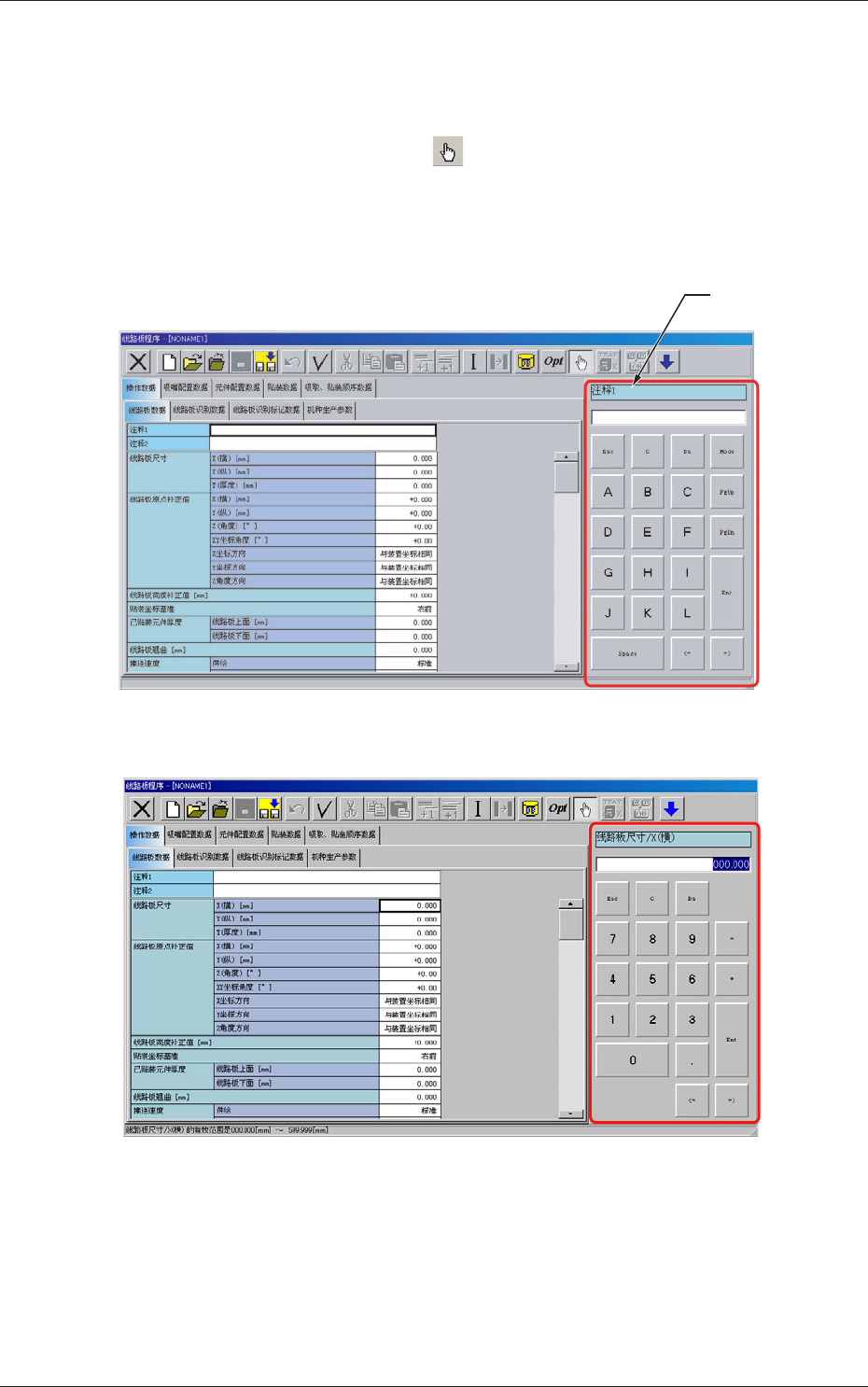 2 - 8 0710 - 001 2.3 用编辑用触摸面板输入数据 2.3 用编辑用触摸面板输入数据 也可以用触摸面板输入数据。 (1) 按显示编辑用触摸面板的 ( ) 图标,显示编辑用触摸面板。 (2) 用触摸面板选择要输入的项目。 变更数据项目名称在编辑用触摸面板的显示。 数据项目名称 Fig.3B12 “ 线路板程序 ” 文本数据编辑界面示例 Fig.3B13 “ 线路板程序 ” 数值输入界面示例