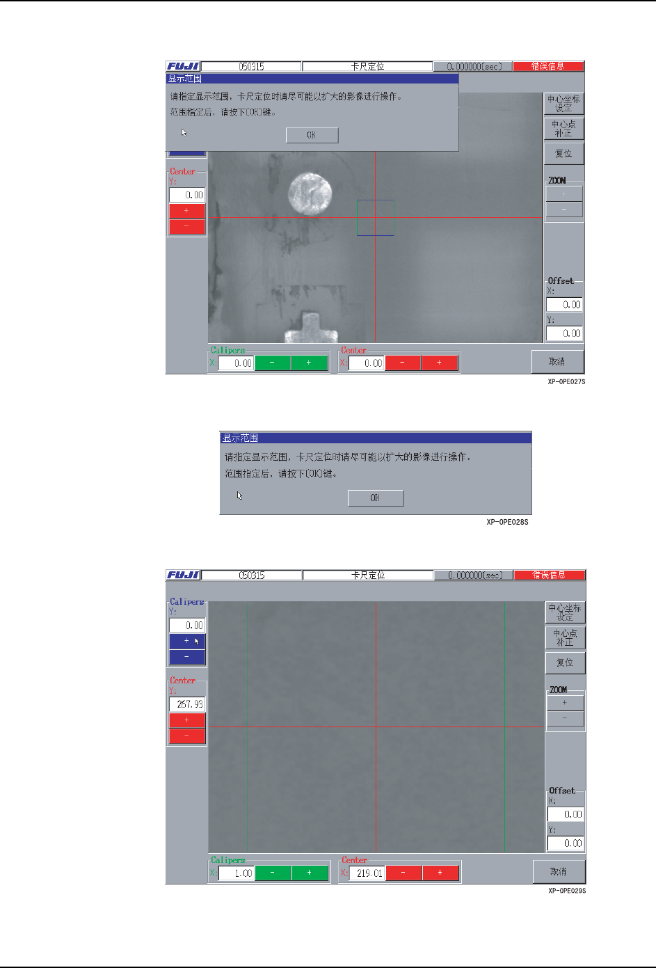 3. 操作系统 SYS-XP243-2.2S 96 XP-242E/243E 系统手册 4. 在 [ 错误信息 ] 画面或者 [ 重试 ] 画面上, 按下 [ 卡尺定位 ] 按键, 显示出 [ 卡尺定位 ] 画面。 5. 显示出 [ 显示范围 ] 对话框,指定范围以便尽 可能较大地显示定位点部分。 6. 移动绿、蓝、红的线进行定位点 的定位。