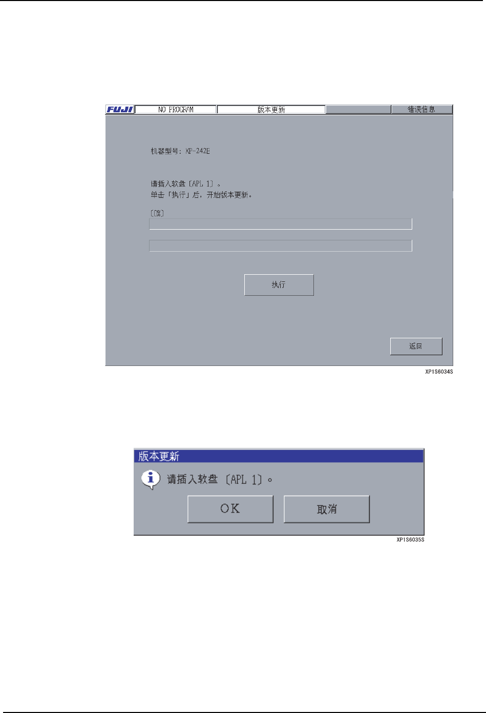 SYS-XP243-2.2S 3. 操作系统 XP-242E/243E 系统手册 163 3.8.2 应用软件的版本更新 应用软件 ( 机器控制软件 ) 的版本更新方法如 下所示。 操作步骤 1. 在 [ 主画面 ] 上选择 [ 维修保养 B]、[ 版本更新 ],显示出以下画面。 2. 把写有 “APL1”的软盘插入软驱中,按下 [ 执行 ] 键。如果不插入软盘 按下 [ 执行 ] 键 后显示出以下的画面。插入软盘按 下 [OK] 键后…
