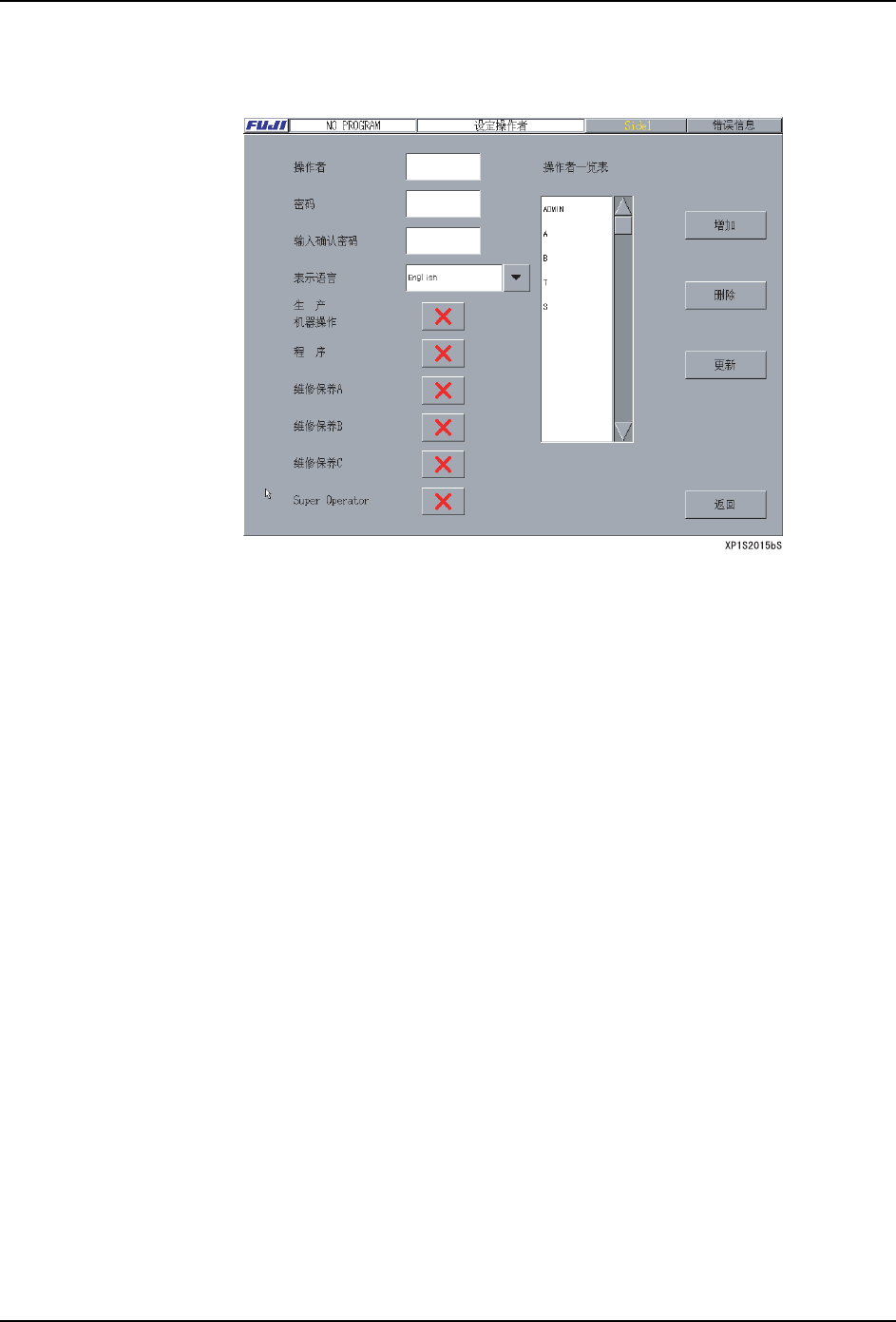 机器启动时增加的操作者名会显示在操作者一览表中。有关操作者的客户化请参阅以后的