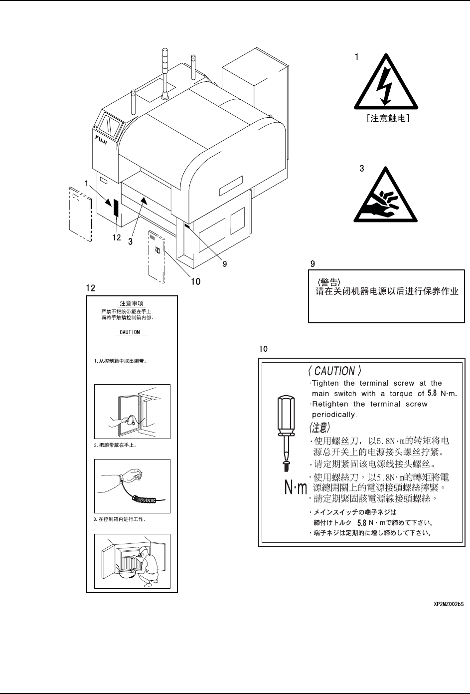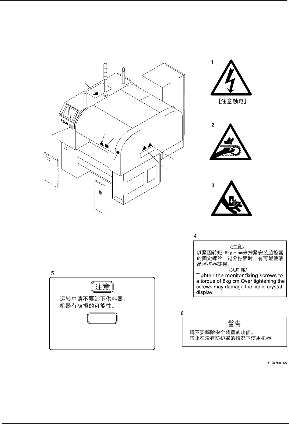 SYS-XP243-2.2S 1. 安全指南 XP-242E/243E 系统手册 7 1.4 安全标示 表示使用机器时的注意事项的标 示牌贴在本机器的如下图所示的位置 , 请仔细阅读, 确保安 全操作。 The machine may be damaged if attempting to remove feeders during operation. CAUTION 2 3 4 3 1 6 5