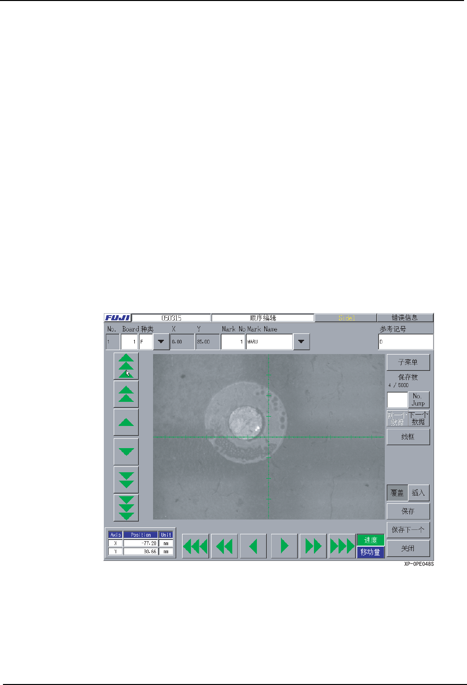 SYS-XP243-2.2S 4. 机器生产程序 XP-242E/243E 系统手册 205 指教功能 在 [ 顺序 ] 画面上按下 [ 指教 ] 按键后, 定位点取入影像显示在触摸屏上。 指教是移动机器 的伺服轴后注册顺序的坐标位置 的功能。 这里的注册是指顺序数据的 X,Y 坐标上覆盖或者插 入实际的电路板上的坐标。注册 的坐标从机器上的 X,Y 坐标变换成实际电路板上的 X,Y 坐 标,所有的基准定位点以基准进 行补正。 注意 )…