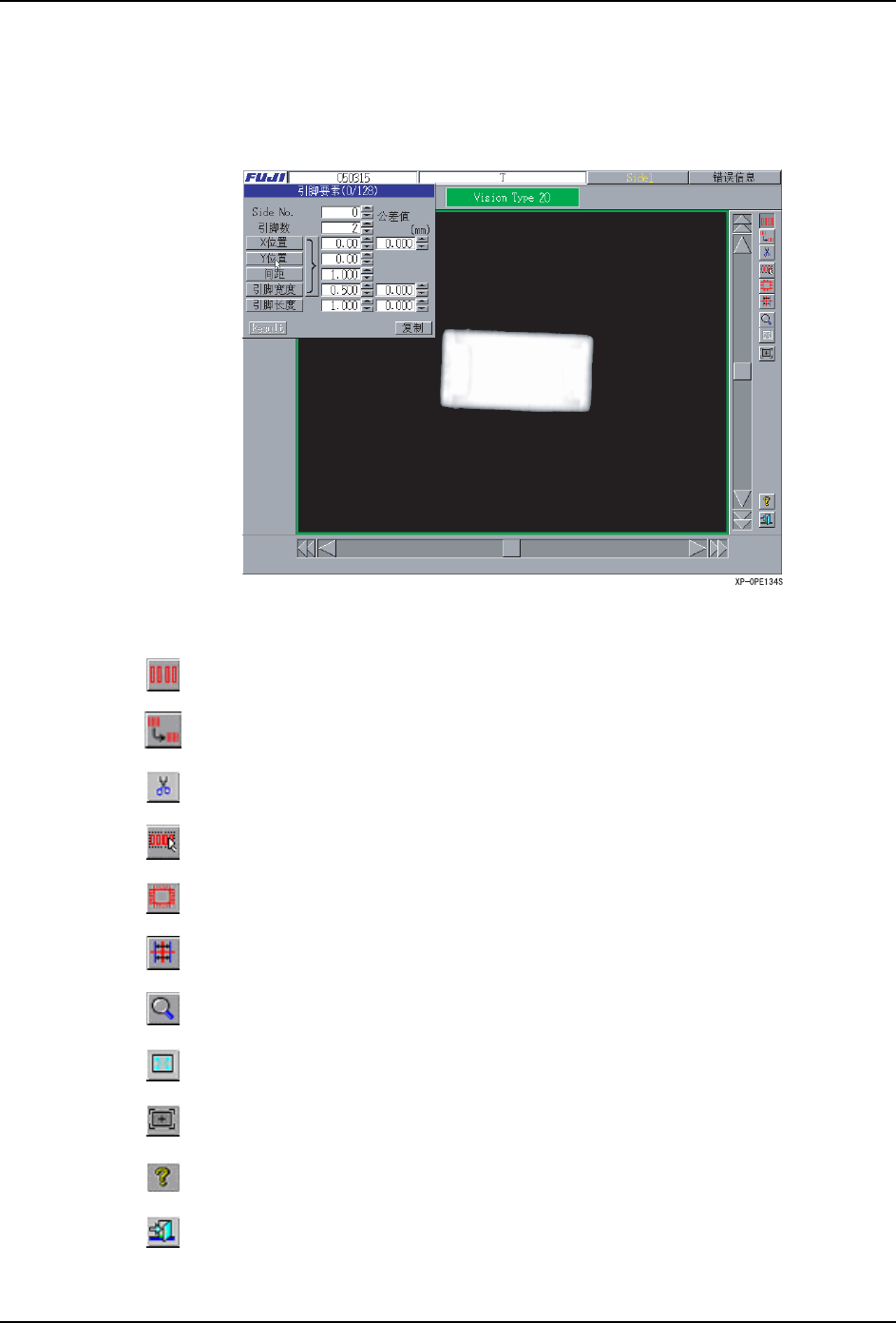 5.MDW/PDW SYS-XP243-2.2S 326 XP-242E/243E 系统手册 5.4.5 用 Vision Type20 编辑 Vision Type20 可以进行引 脚要素的设定、生 成。 编辑的单位以称作为要素的引脚 群组单位进行, 要素有必要在 2 个(引脚有 1 根也可以) 以 上。 按键说明 是引脚要素输入模式。 复制选择的引脚要素数据。 全部删除选择的要素数据。 是引脚要素自动输入模式。 是引脚要素全自动输入…