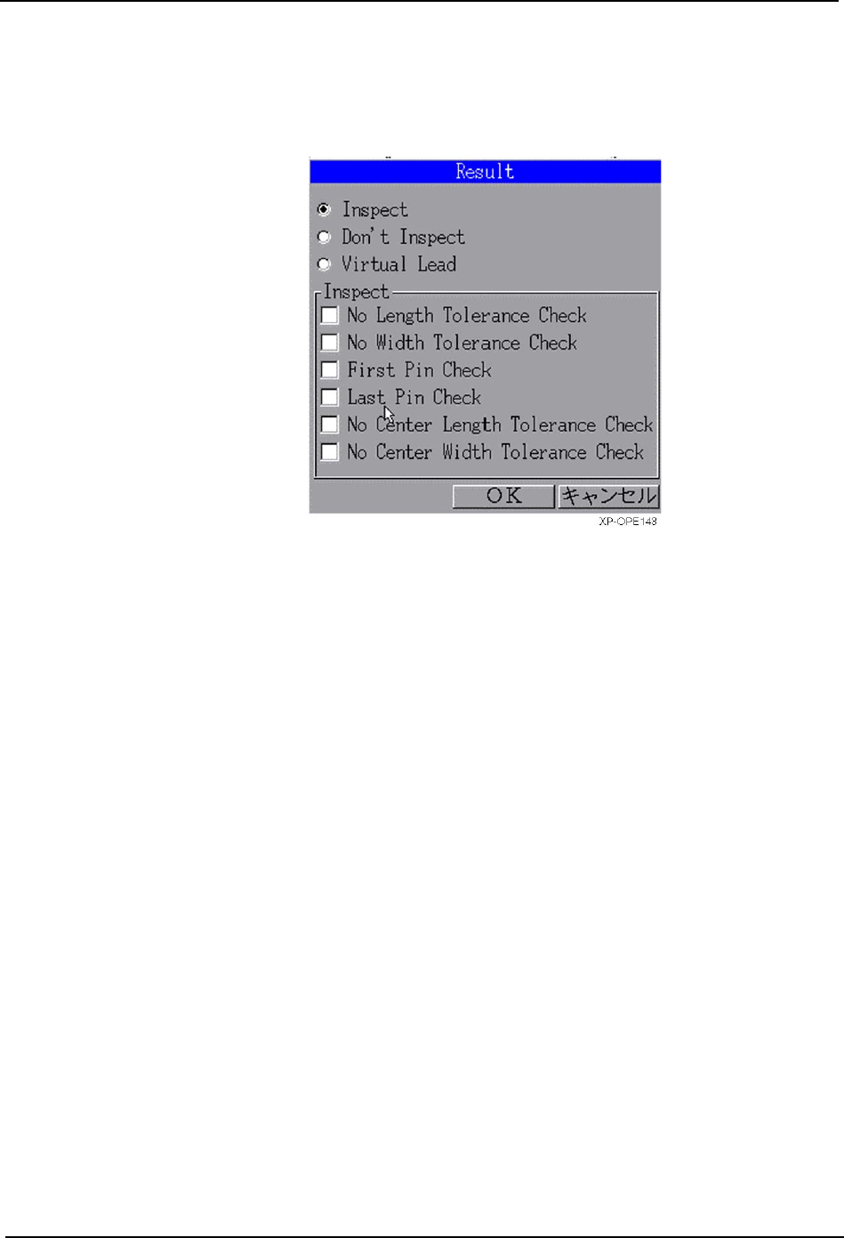 SYS-XP243-2.2S 5.MDW/PDW XP-242E/243E 系统手册 331 引脚影像处理时的检查内容设定 (Result) 在 [ 引脚要素 ] 对话框 上按下 [R esult] 按 键后打开 [Result] 对话 框, 显示出引脚 影像处理 时的检查内容。 「Inspect 」栏的项目设定是从上述 3 个项目中选择 Inspe ct 时有效的项目。 ·Inspect 在影像处理时选择通常的元件。 ·Don’t I…