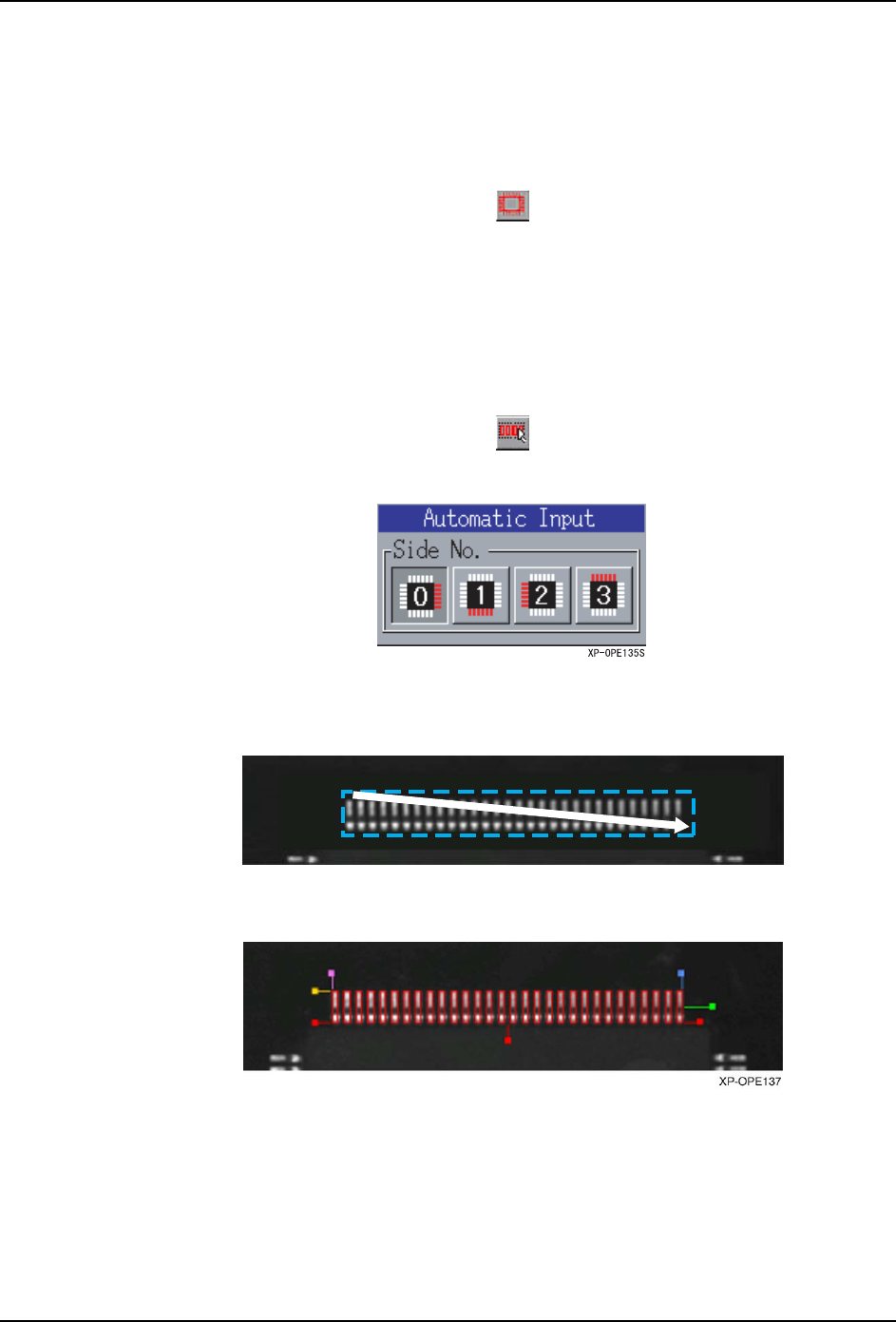 SYS-XP243-2.2S 5.MDW/PDW XP-242E/243E 系统手册 349 5.4.7 用 Vision Type124 编辑 Vision Type124 可以进行引脚要素的设定、生成。 编辑的单位以称作为要素的引脚 群组单位进行, 要素必须有 2 个 (引脚有 1 根也可以) 以上。 按键说明 是引脚要素输入模式。 复制选择的引脚要素数据。 全部删除选择的要素数据。 是引脚要素自动输入模式。 是引脚要素全自动输入模…