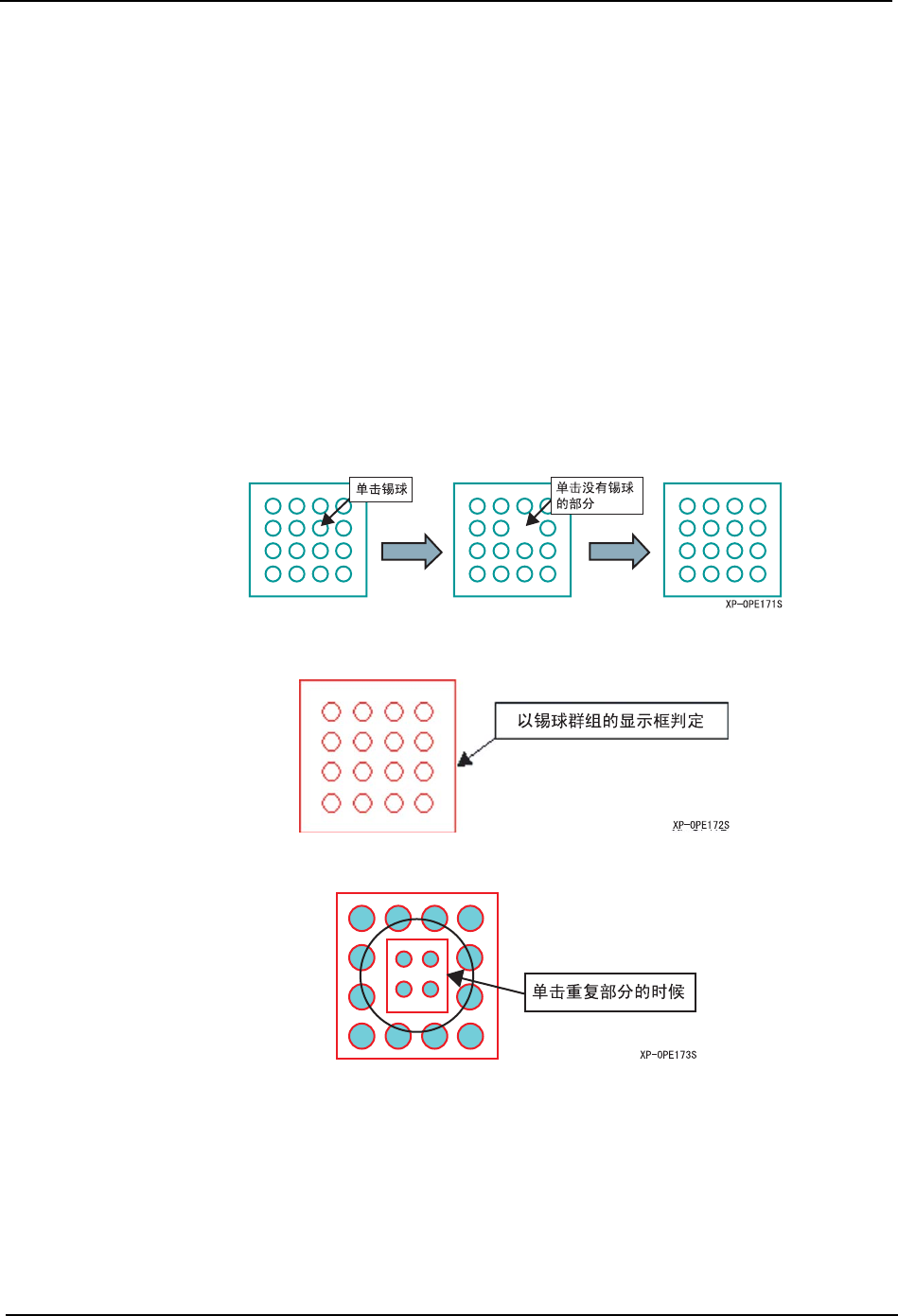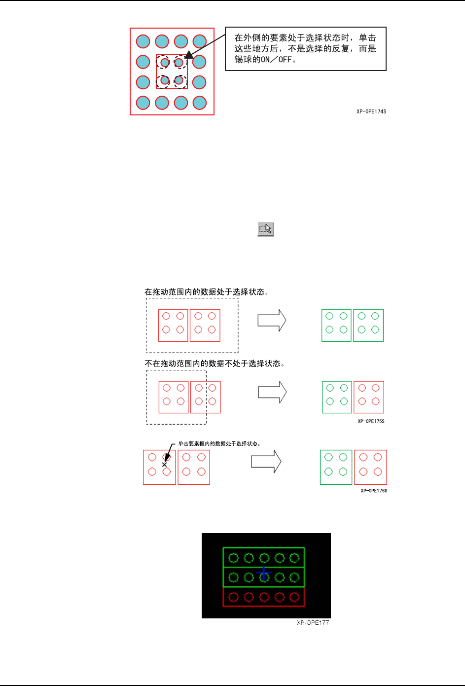 5.MDW/PDW SYS-XP243-2.2S 374 XP-242E/243E 系统手册 7. 在设定完的要素上输入要 素时,一边按下 Shift 按 键一边单击。选择操作变为无效后可 以进行输入处理。 现有要素的一次性编辑 在此模式上,手柄不显示在选择 的要素上。编辑在 [ 锡球要素 ] 对话框上进行。 1. 按下下图,进入要素一次性变更 模式。 2. 将编辑的要素用鼠标的拖动操作 或者单击进行选择。 备注 ) 在此模式上不显示移…