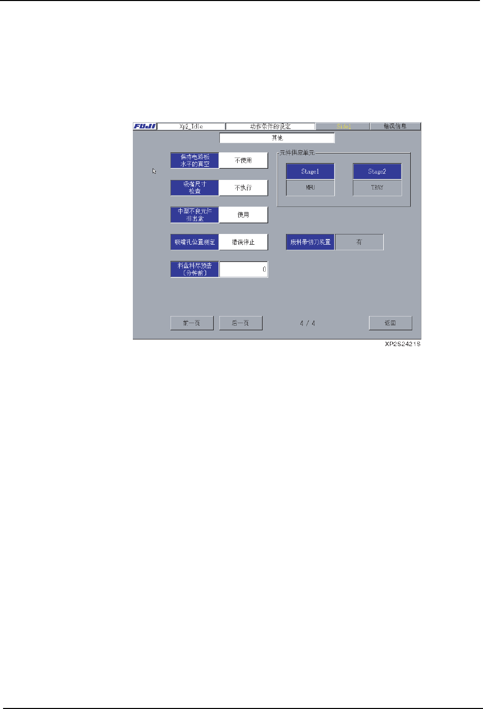 3. 操作系统 SYS-XP243-2.2S 38 XP-242E/243E 系统手册 · 「元件供应单元」根据安装的单元而变化。 [MFU] : 安装了 MFU 的状态。 [TRAY] : 安装了 TRAY 的状态。 [ 无 ] : 没有安装元件 供应单元状态。( 单侧元件供应状态 ) [ 固定供料平台 ]: 使用不可装卸的固定供料平台状态 。