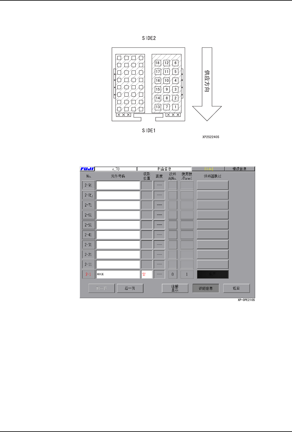 3. 操作系统 SYS-XP243-2.2S 66 XP-242E/243E 系统手册 显示用于生产的元件的料站及其吸取凹槽。 吸取位置是在料盘安装于机器上的状态下, 从 SIDE1 看把右下角作为 1,并按照以下顺序吸取元件。 3. 按下 [ 详细信息 ] 按键,可以更进一步地显 示详细的料盘信息。在此也可以进行 机器上 的跳过。 项目说明 Next Slot: 显示出在 [ 编辑器 ] 的[ 供料器安装 ] 编辑画面上安装的次料 站…