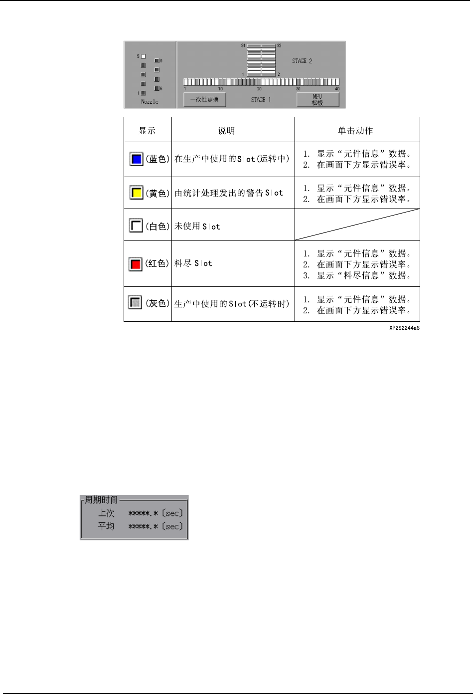 3. 操作系统 SYS-XP243-2.2S 76 XP-242E/243E 系统手册 显示设定在生产程序中的平台、 料站信息。 显示机器判断为 [ 料尽 ] 的料站。 按下 [ 元件设定结束 ] 按钮后,机器进入元件 安装状态。 在以下的区域中显示出各个吸嘴 的状态。