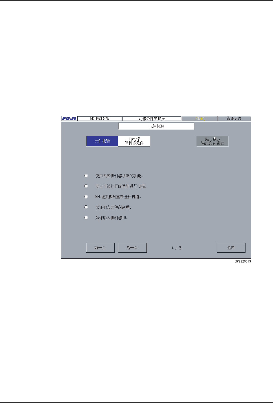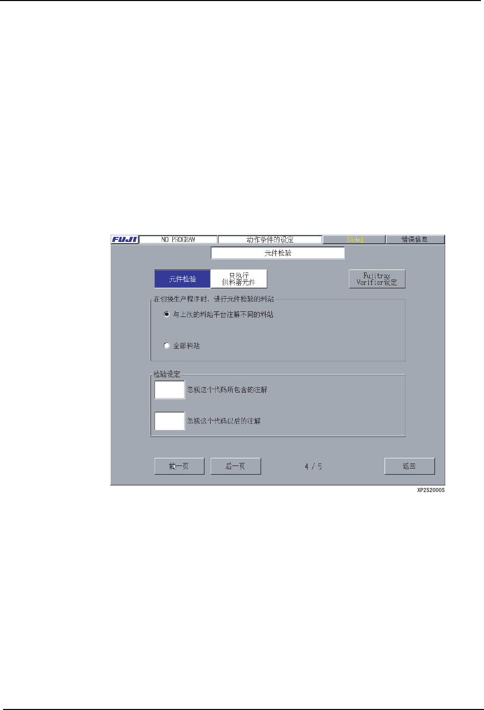 3. 操作系统 SYS-XP243-2.2S 36 XP-242E/243E 系统手册 忽视用设定的记号括起来的部分 。 · 「忽视这个代码以后的注解」: 忽视所设定的记号的以后部分。 6. 按下 [FujitraxVer ifier 设定 ] 按键,显示 出 F ujitraxVerifier 设定画面。 7. 选择检验的功能。 · 「使用反映供料器状态的功能」: 发生了关于元件 的错误时, 设定是 否在 KIT Manager 上重…