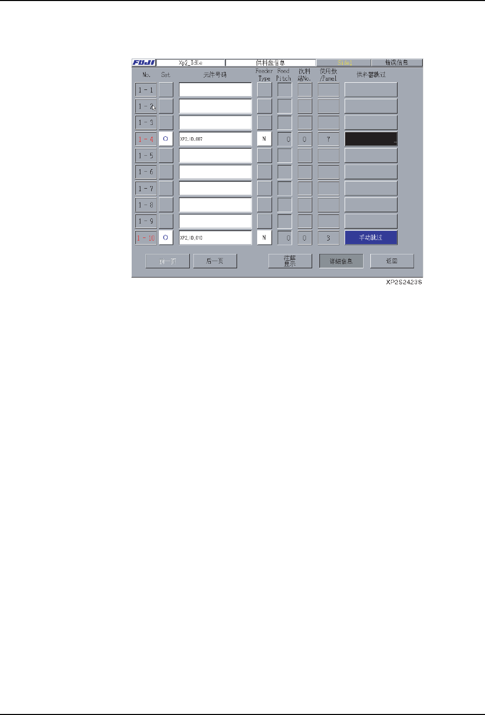3. 按下 [ 详细信息 ] 按键,可以更进一步地显示详细的供料器的信息。在此也可以进行机