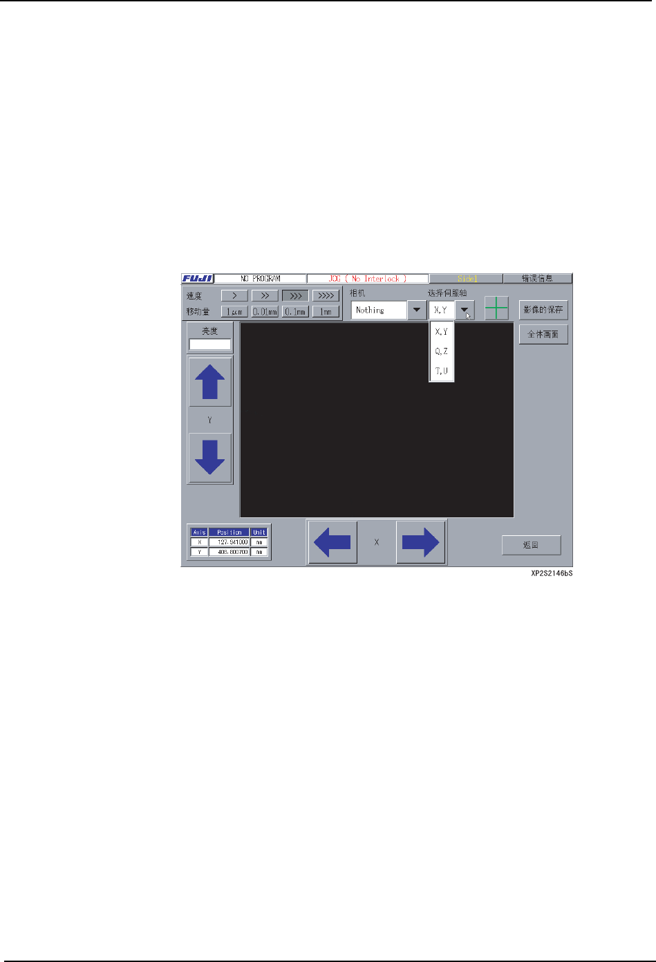SYS-XP243-2.2S 3. 操作系统 XP-242E/243E 系统手册 71 3.3.11 微动 使用微动键来移动轴 在触摸屏上显示出微动键, 可以用手动操作移动各个轴。 除了在以下情况以外, 任何时候都 可以进行微动操作。 · 在机器处于等待 [ 启动 ] 的状态时 · 机器正在运转时 · 在没有解决紧急停止故障原因之前 · 屏幕上没有显示微动画面时 以下画面为微动轴选择画面。 注意 ) 上述画面是 [ 主画面 ]、[ 维修…