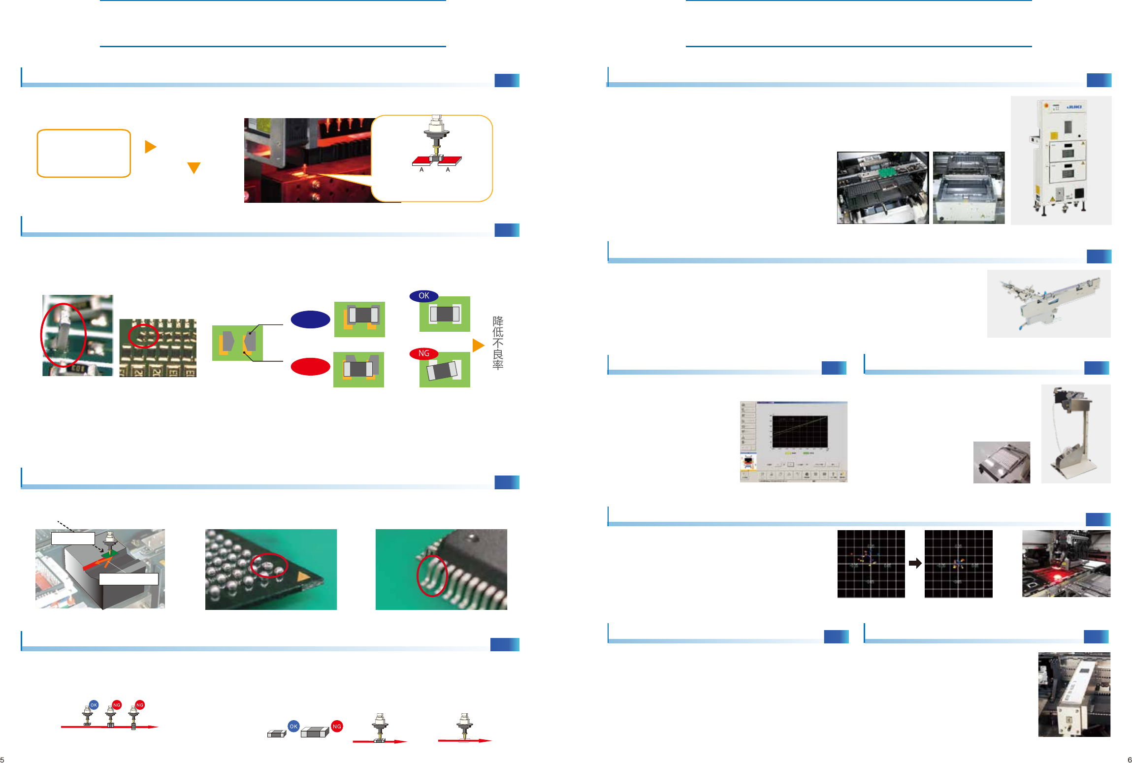 ●识别焊锡印刷补偿贴片位置功能 通过贴片机内的OCC相机,识别出焊锡印刷的位置偏移,参照焊锡位置补正贴片坐标位置 , 降低了因焊锡印 刷位置偏移造成的回流后不良率。 (自动调整效果) 元件立碑 位置偏移 ②部品姿势检查 比较吸着的部品尺寸比和设 定部品尺寸比、确认吸着正 确姿势的部品 ①芯片部品站立检查 可以激光判定芯片站立。 ③错误部品检查 把吸着的部品尺寸和设定部 品尺寸比较、确认吸着正确 的部品。 ⑤释放检查 贴装后再次用激光照射…