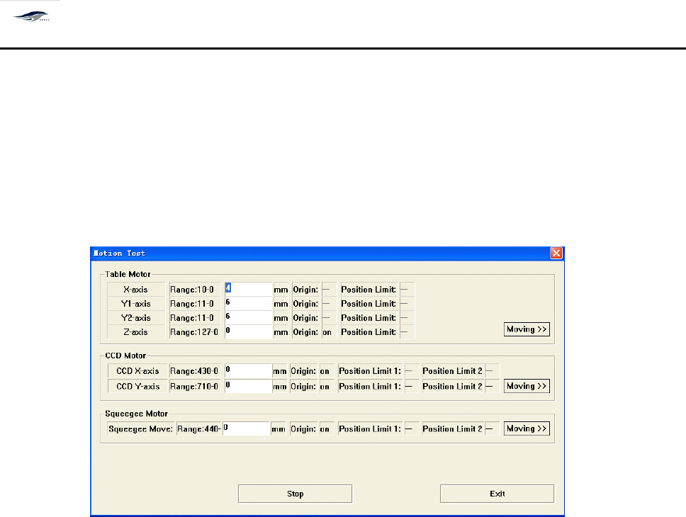 position, the system will display “ ON ” and “ - ” respectively. C licking Stop will stop the motion of