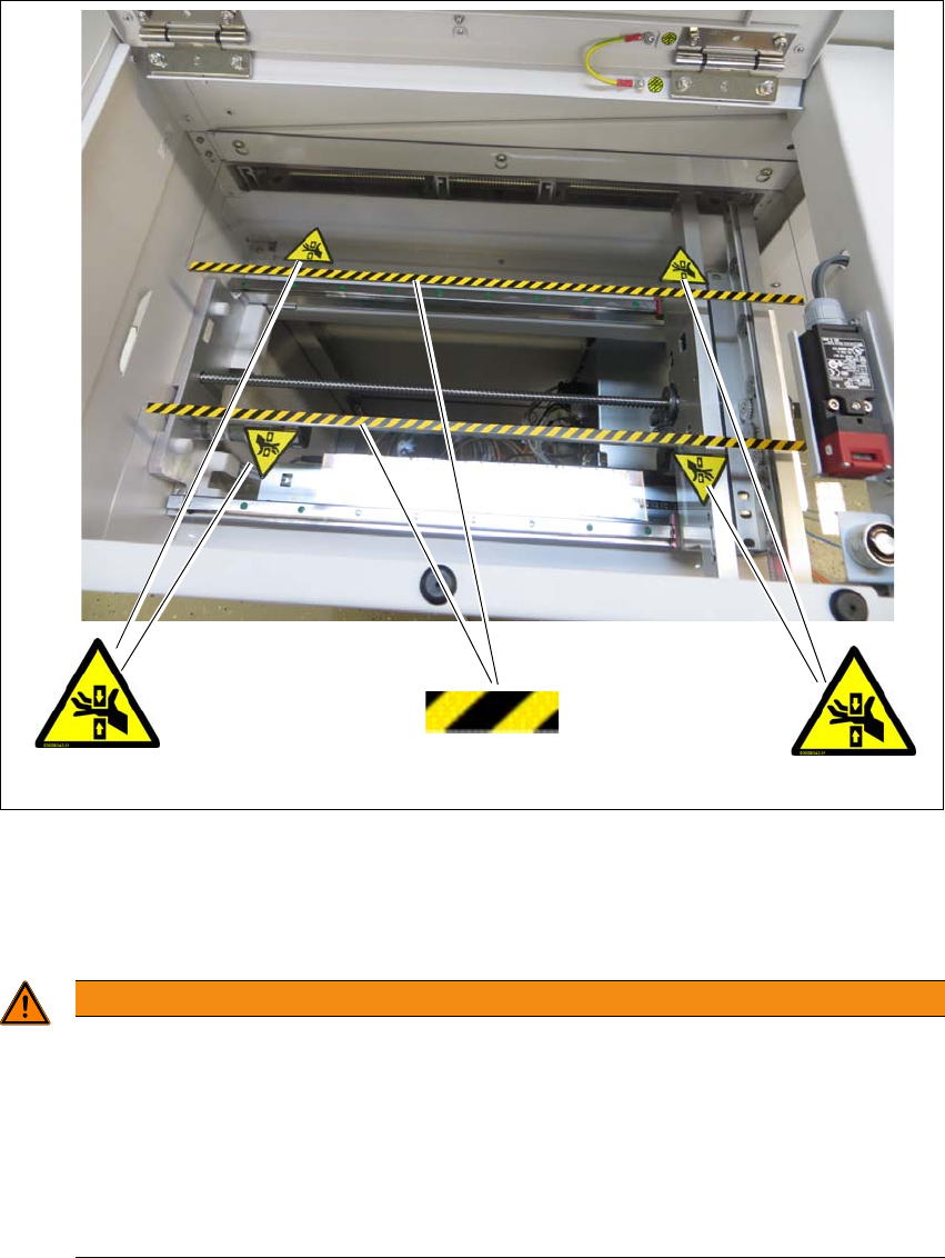 Montage- und Betriebsanleitung 2 Betriebssicherheit Shuttle Extension Ausgabe 06/2017 2.2 Warnschilder 27 Abb. 2.2 - 4 Warnschilder im Inneren der Shuttle Extension - Tei l 2 (1) Warnstreifen am Eingreifschutz Pos. W 203…