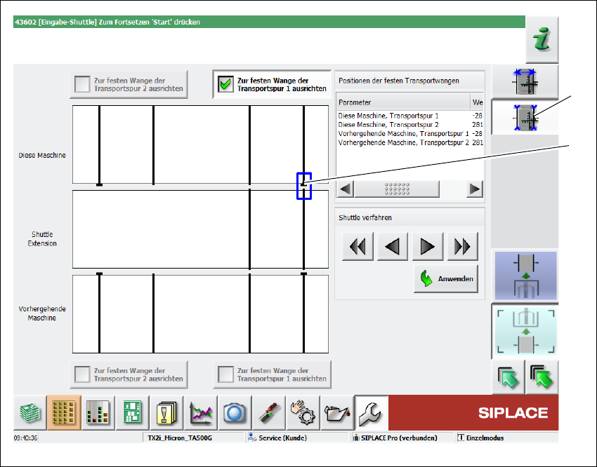 Wenn die Position der jeweiligen Transportkante der Shuttle Extension mit der derzeit aus-