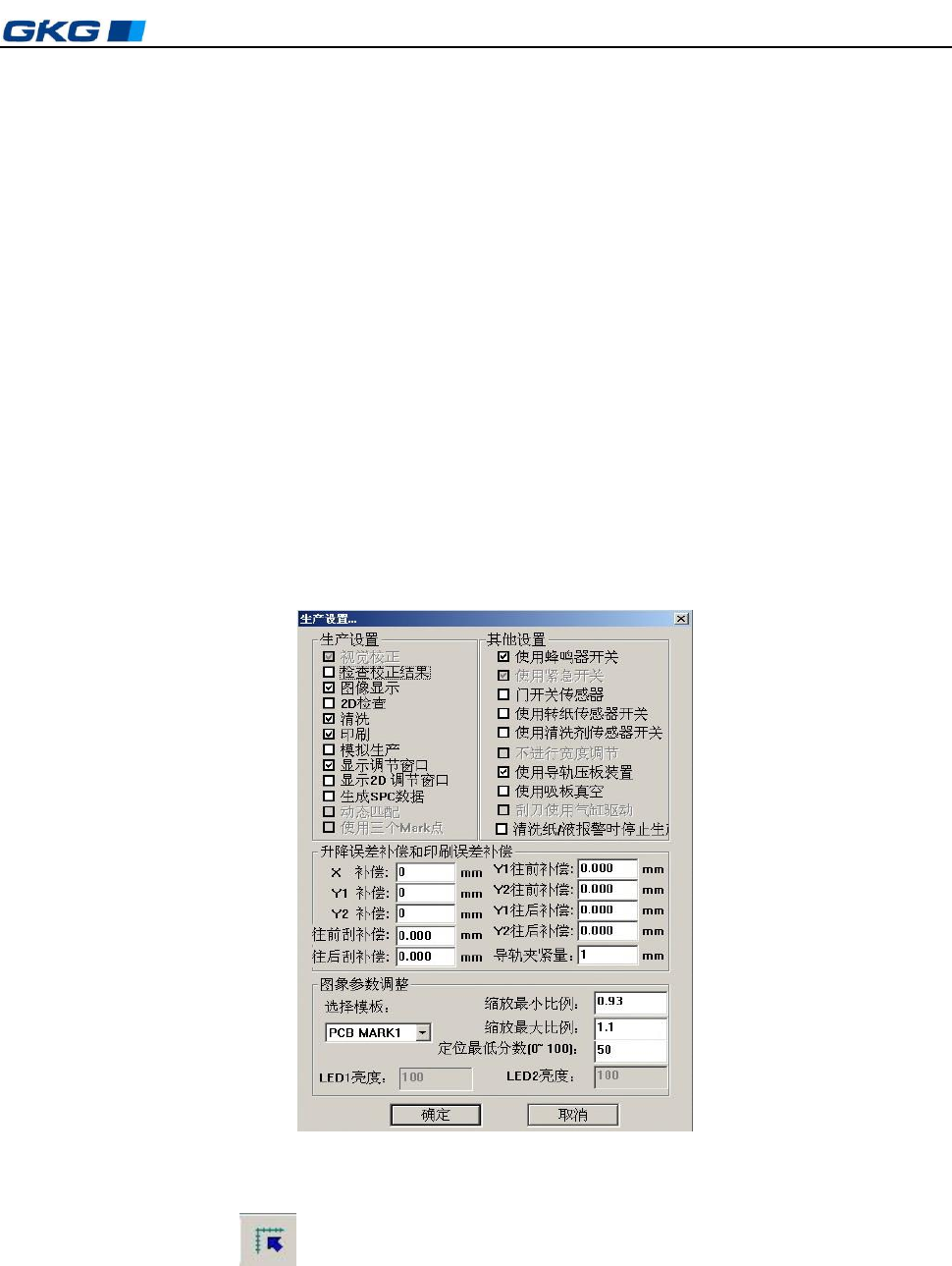 检测等生产设置及其他设置(如门开关感应器的设置等)。同时可对工作台升降误差及刮刀行