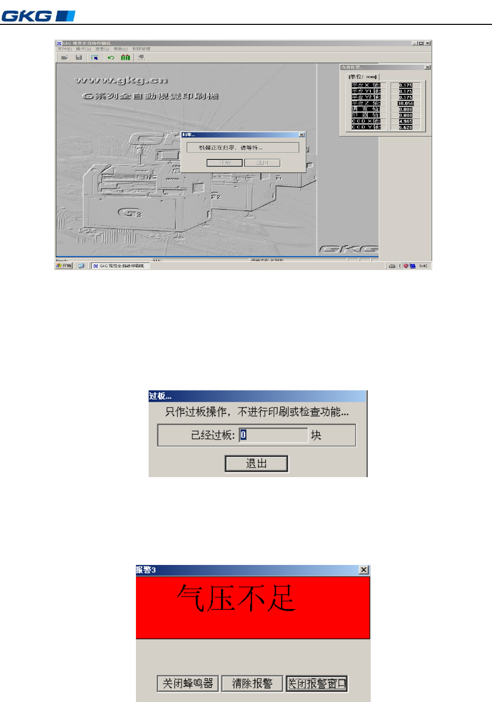 凯格精密机械有限公司 - 27 - 第四章 操作系统说 明 图 4-25 归零操作 4.2.2 .7 PCB 运输 1. 在主窗口画面单击 “ 过板 ” 图标, 出现 [ 过板 ] 对话框, 作用是只作过板操作, 不进 行印刷或检查功能。如图 4 - 26 所示: 2. 单击 [ 退出 ] 仍回到主窗口画面。 图 4-26 〈过板〉操作对话框 4.2.2. 8 报警复位 当机器出现故障或按下紧急制动器, 屏幕显示 [ 报警 ] 对话框,…