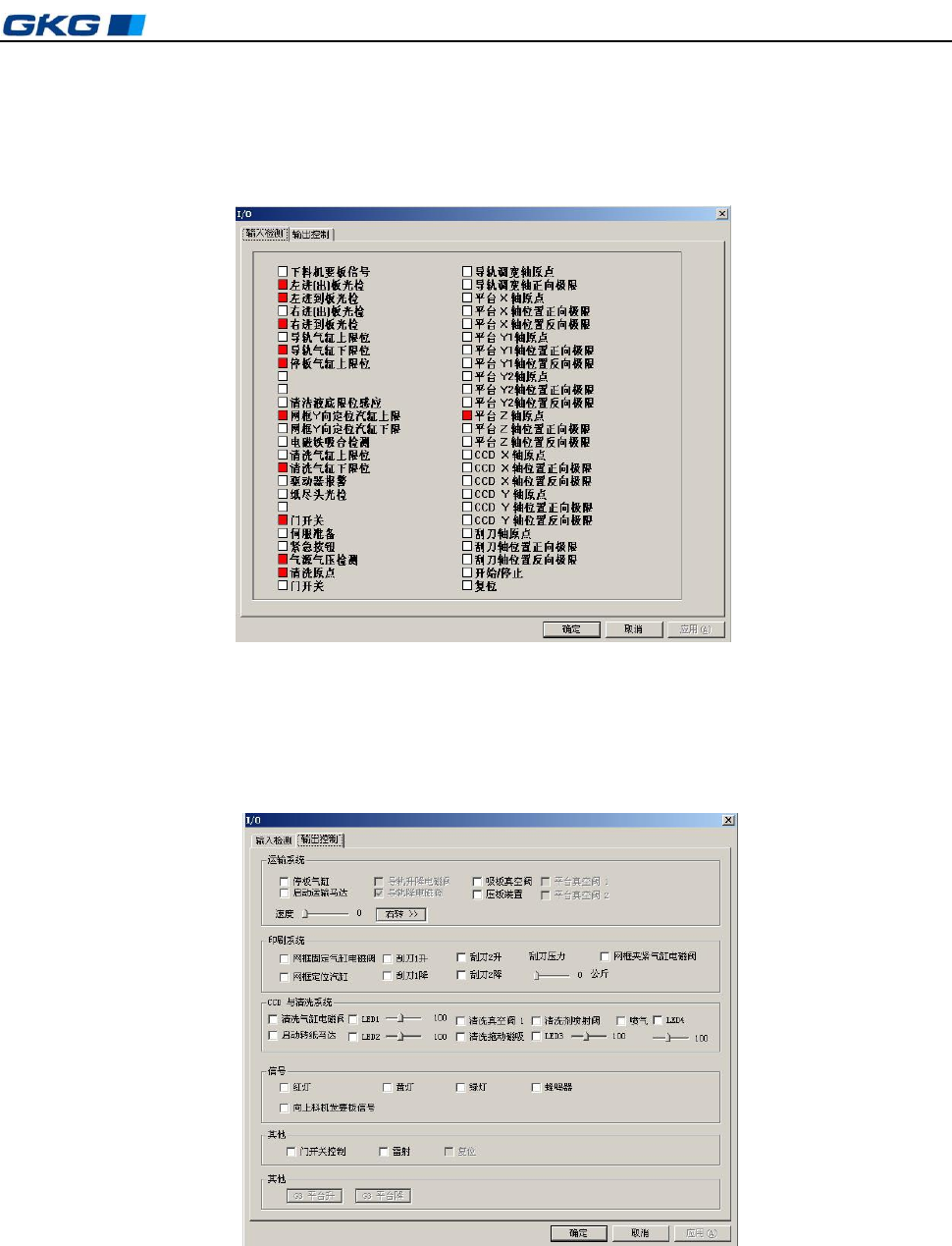 凯格精密机械有限公司 - 34 - 第四章 操作系统说 明 1. 单击 [ 运动控制 ] 图标, 弹出 [ 运动控制 ] 对话框, 如 图 4 – 40 所示: 逐一输入马达控制轴、 刮 刀或导轨等的行程,单击 [ 移动 ] 按钮,使轴、 刮刀、或导轨运动。运动到原点位置显示 “ ON ” , 离开原点位置显示 “一” ; 运动到极限位置显示 “ ON ” , 离开极限位置显示 “一” 。 2. 单击 [ 停止 ] ,停止轴、刮刀或导轨…