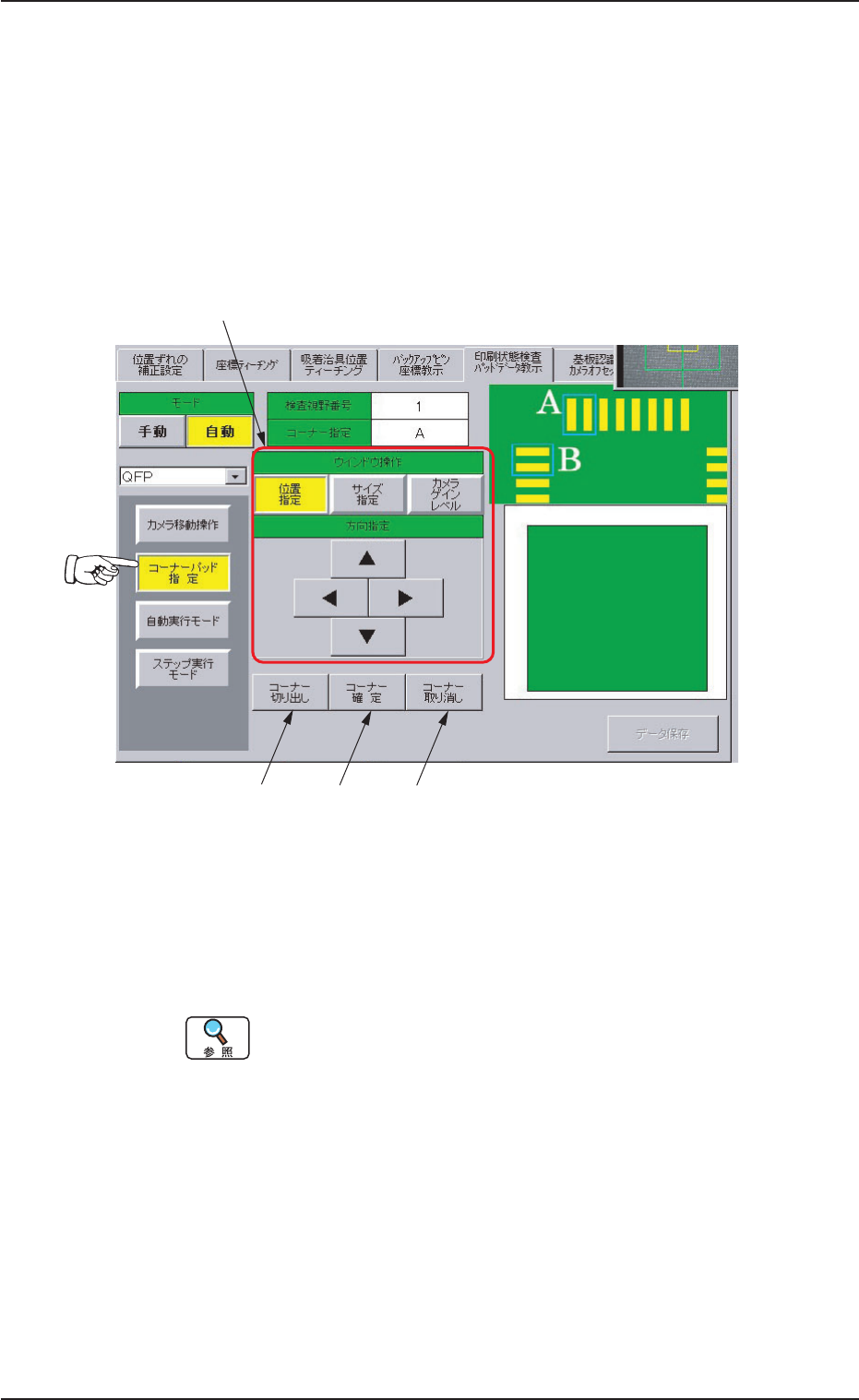 7.5.1 7.5.1 7.5.1 7.5.1 7.5.1 “ “ “ “ “ コ コ コ コ コ ー ー ー ー ー ナ ナ ナ ナ ナ ー ー ー ー ー パ パ パ パ パ ッ ッ ッ ッ ッ ド ド ド ド ド 指 指 指 指 指 定 定 定 定 定 ” ” ” ” ” 画面 画面 画面 画面 画面 コーナーパッドの切り出しを行います。 • 画面の表示 画面の表示 画面の表示 画面の表示 画面の表示 “自動ティーチング”シートの…