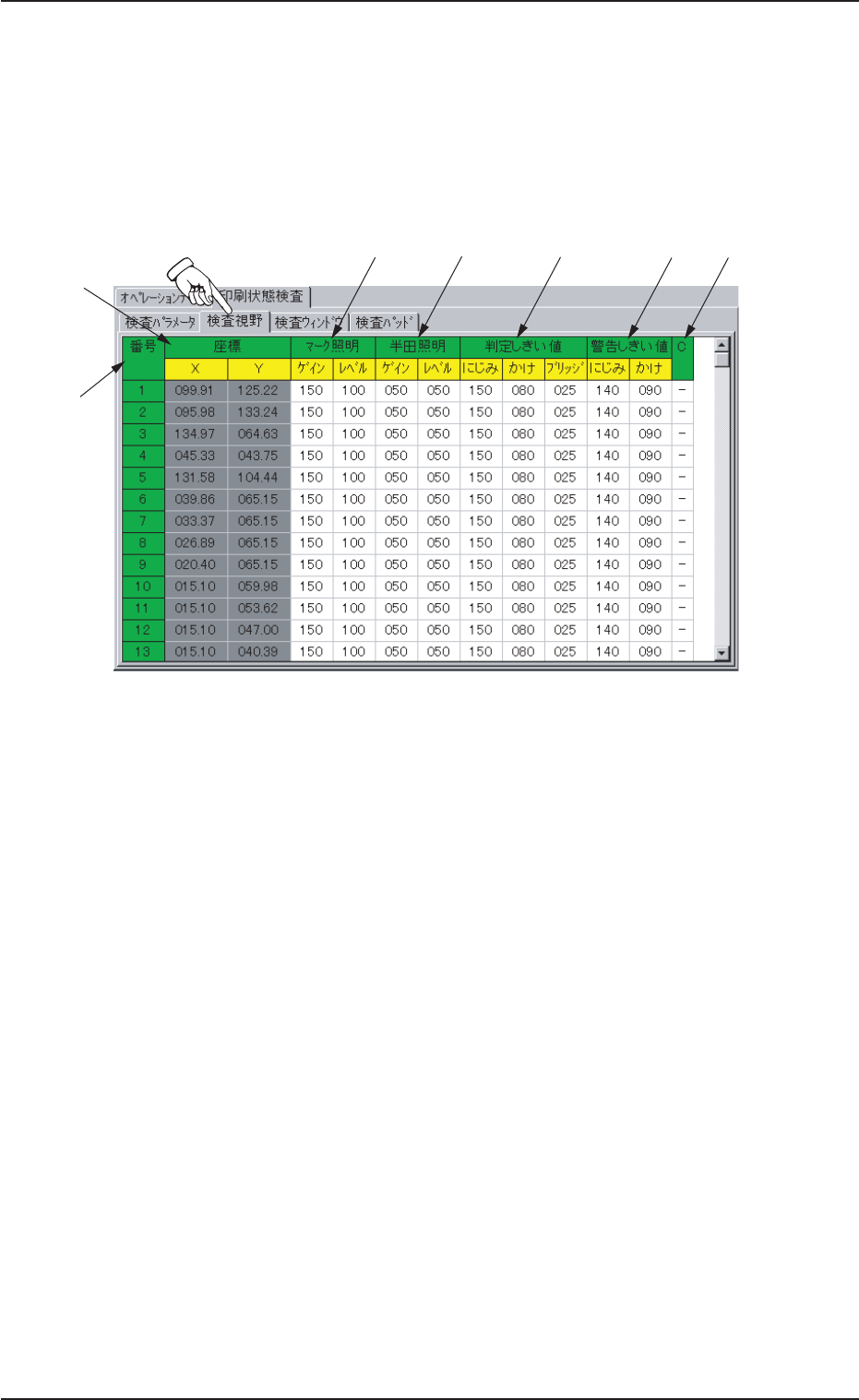 8.2 “検査視野” タブ 㧖 㧖 㧖 㧖 㧖 㧖 㧖 0210-001 35 AHK01JGP 8.2 8.2 8.2 8.2 8.2 “ “ “ “ “ 検 検 検 検 検 査 査 査 査 査 視 視 視 視 視 野 野 野 野 野 ” ” ” ” ” タブ タブ タブ タブ タブ • シートの表示 シートの表示 シートの表示 シートの表示 シートの表示 “印刷状態検査”タブシートで、 [検査視野]タブを押すと、以下の…