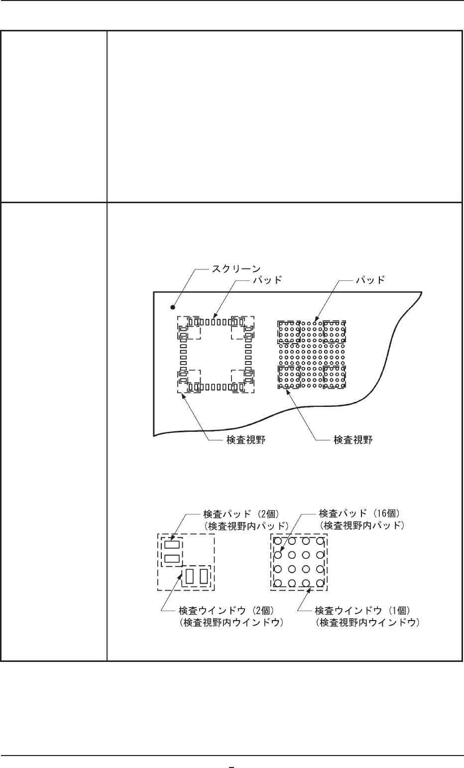 1. 1. 1. 1. 1. 概 概 概 概 概 要 要 要 要 要 本仕様により、基板へのソルダペーストの印刷状態を検査できるため、 印刷不良基板が後工程へ流れるのを防ぐことができます。 • 部品の装着前に印刷異常を検出することにより、部品のロスを低減させるこ とができます。 • スクリーンの汚れやソルダペーストの乾きなどの発見に役立てることがで きます。 2. 2. 2. 2. 2. 仕 仕 仕 仕 仕 様 様 様 様 様 Tabl…