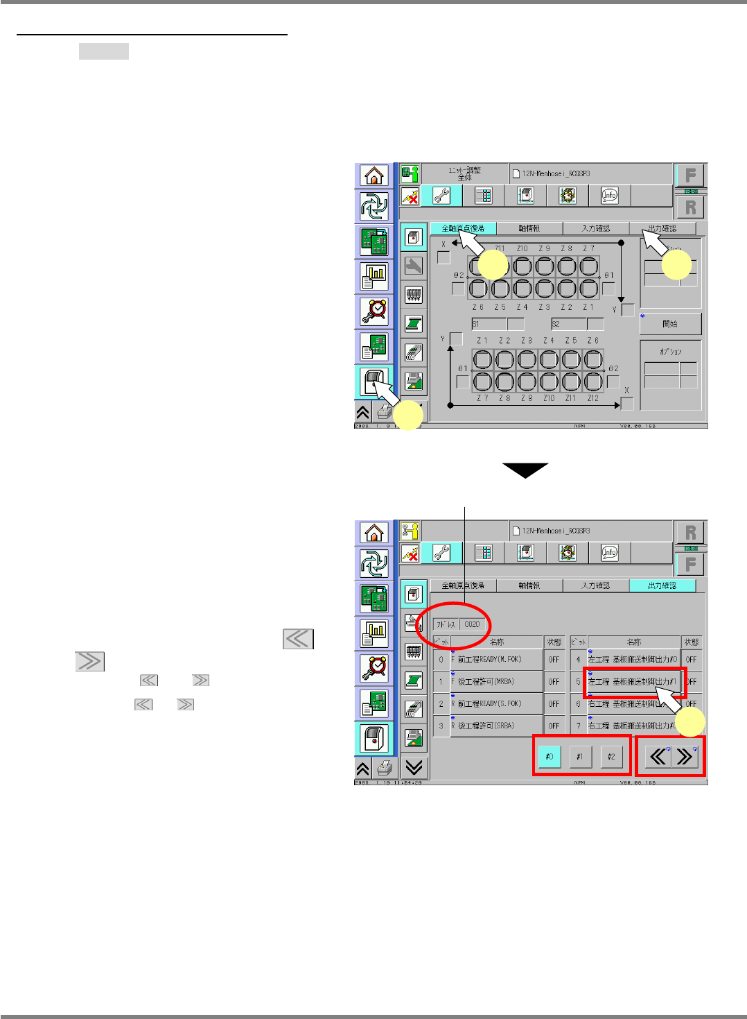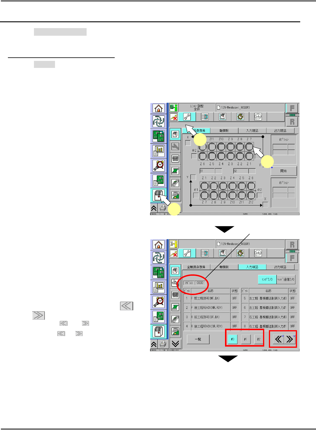 NPM-D3 SERVICE MANUAL 7.1 Machine I/O Confirmation EJM6D3-MB-07SM-00( 編集中 ).DOC Page 7-3 6. Confirm the State column. 状態を確認します。 确认状态。 Confirm the input state (ON/OFF). 入力状態 (ON / OFF) を確認 确认输入状态 (ON / OFF) Pressing the…