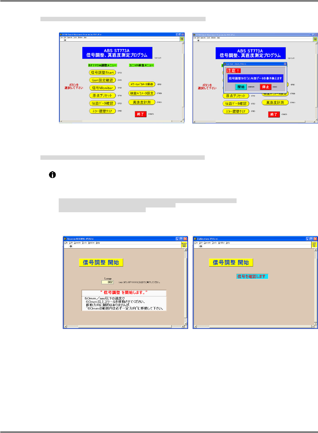 单击[信号调整 Start]后会打开注意窗口,此时单击[开始]。(Fig. 7, Fig. 8)