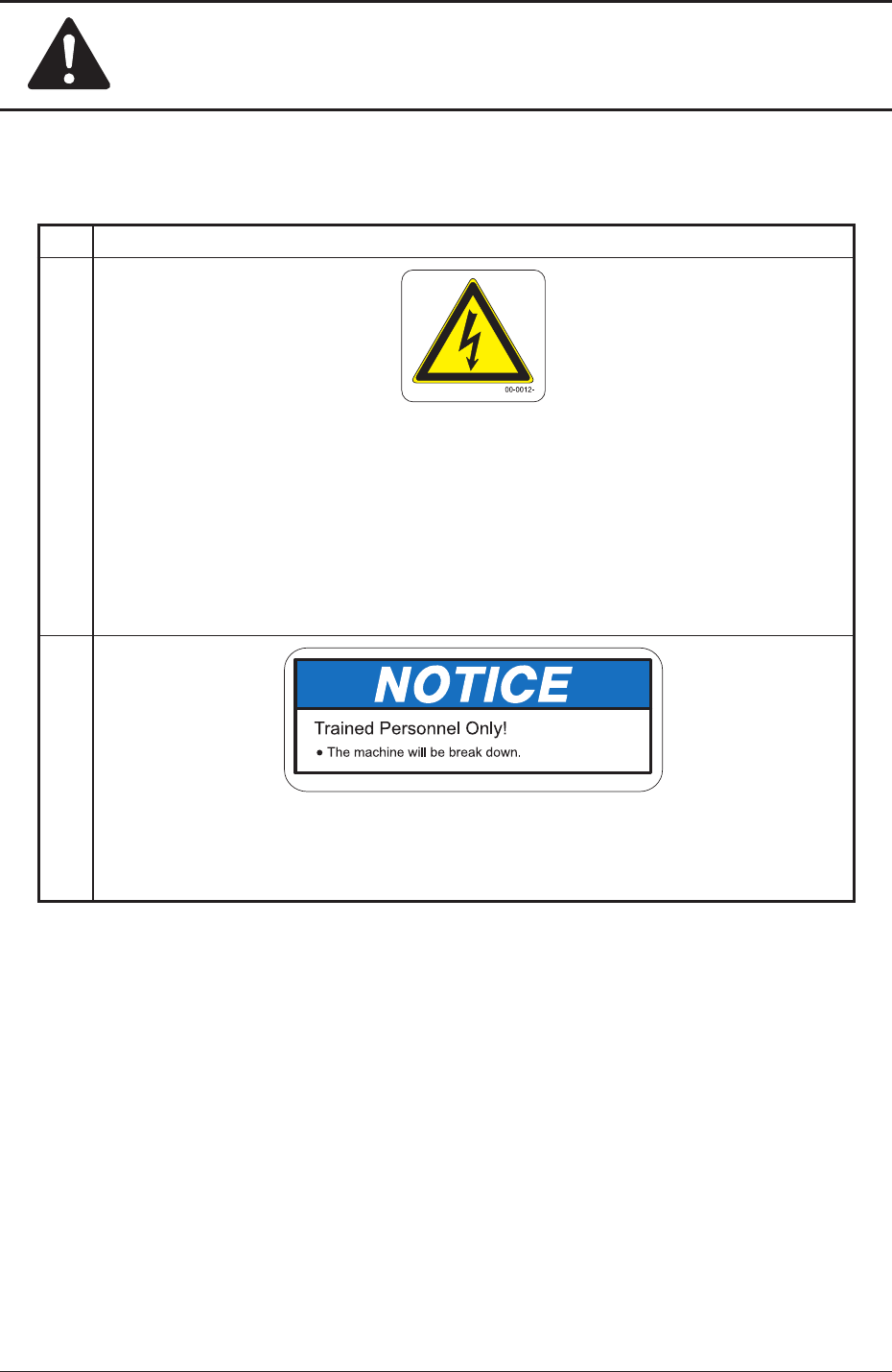 Safety Precautions Safe-6 OM-1646 Alert Labels and Description No. Alert Labels and Description (1) Description This label indicates that high voltage is applied to the area. Residual voltages may remain behind for a f…
