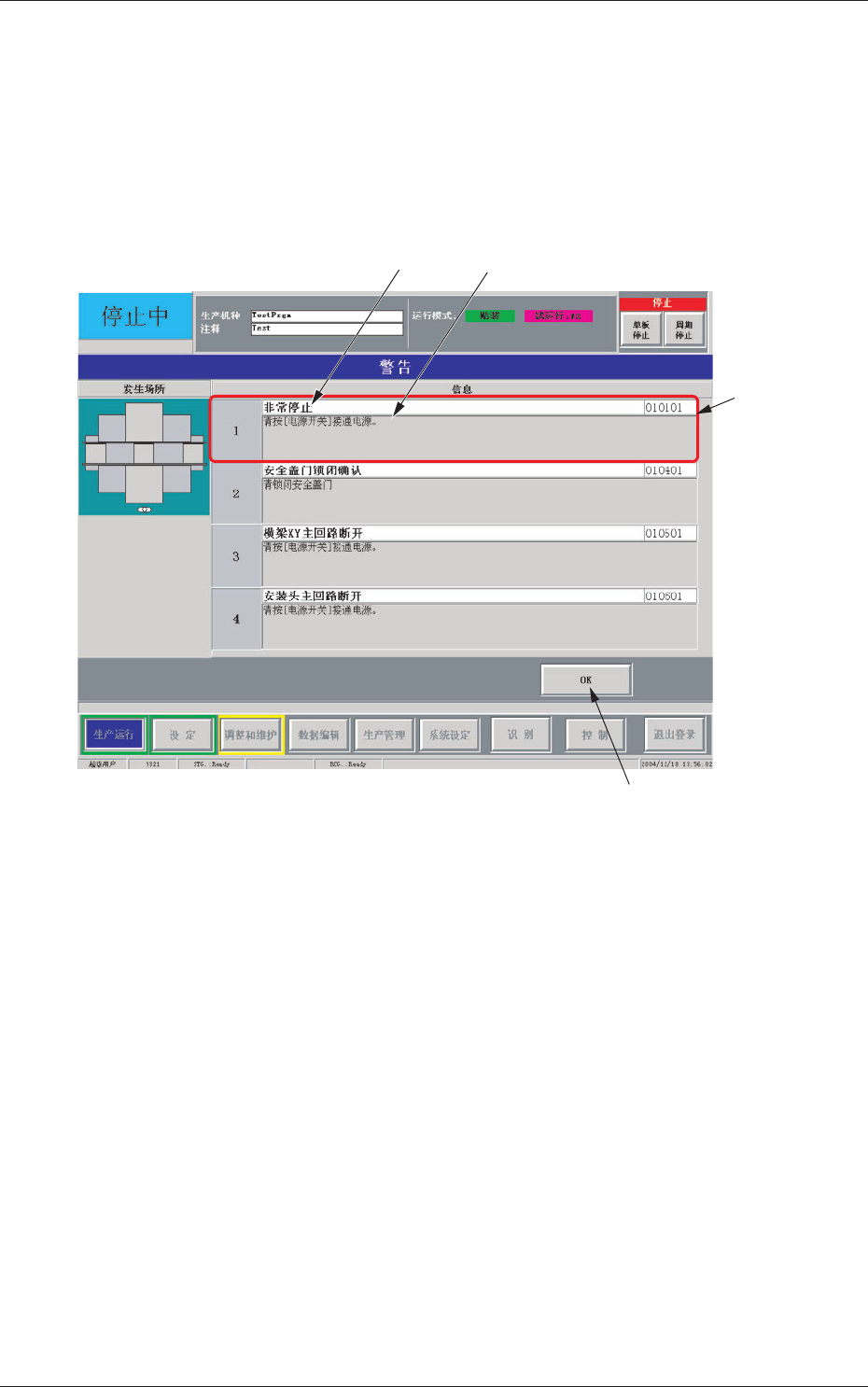 2 - 2 0606 - 001 2. 警告 ( 启动向导 ) 2.1 关于警告 ( 启动向导 ) 界面 在装置误操作或异常发生后没有正确复位时, 显示如下警告 ( 启动向导 ) 界面。 [2] [3] [1] [4] Fig.4B2 警告 ( 启动向导 ) 示例 [1] 警告 ( 启动向导 ) 显示警告 ( 启动向导 )。 [2] 显示区分 A 显示警告 ( 启动向导 ) 的概要。 [3] 显示区分 B 显示警告 ( 启动向导 ) 的…