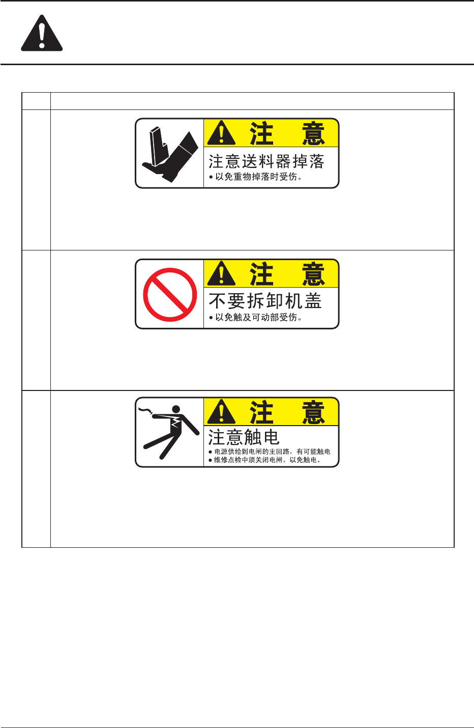 安全 - 25 No. 警告标签及其说明 (8) 说 明 开闭机盖 ( 开闭安全门 ) 时,请握紧把手慢慢上下移动。 以免被安全门夹住手而受伤。 (9) 说 明 本装置的 XY 横梁运行部使用强力的永久磁铁。 • 请不要使易带磁性的金属靠近。 以免被磁性吸住而受伤或导致装置故障。 • 请不要使易受磁性影响的物品 ( 磁卡和钟表类 ) 靠近。 强烈的磁性会导致磁卡数据消失、损坏钟表类。 (10) 说 明 移动送料器批量更换推车…