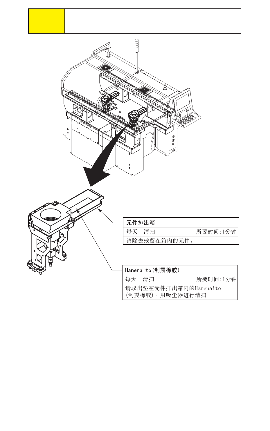 1 - 21 3.3.3 元件识别照相机部 Notice 请务必使用吸引源 ( 吸尘器 ) 进行清扫。 请勿使用吹气 ( 气枪 ) 。 元件识别照相机 毎天 清扫 所要时间:4分钟 请用真空镊子取出掉落的元件,用镜头布擦 去灰尘。 Fig.4A14 Note 也备有 G-S047-01 粘性清洁器 ( 元件编号 :630 133 0679)( 选项 )。 粘性 清洁器 Fig.4A14-1 0606 - 001 3.3 点检、清扫、注油…