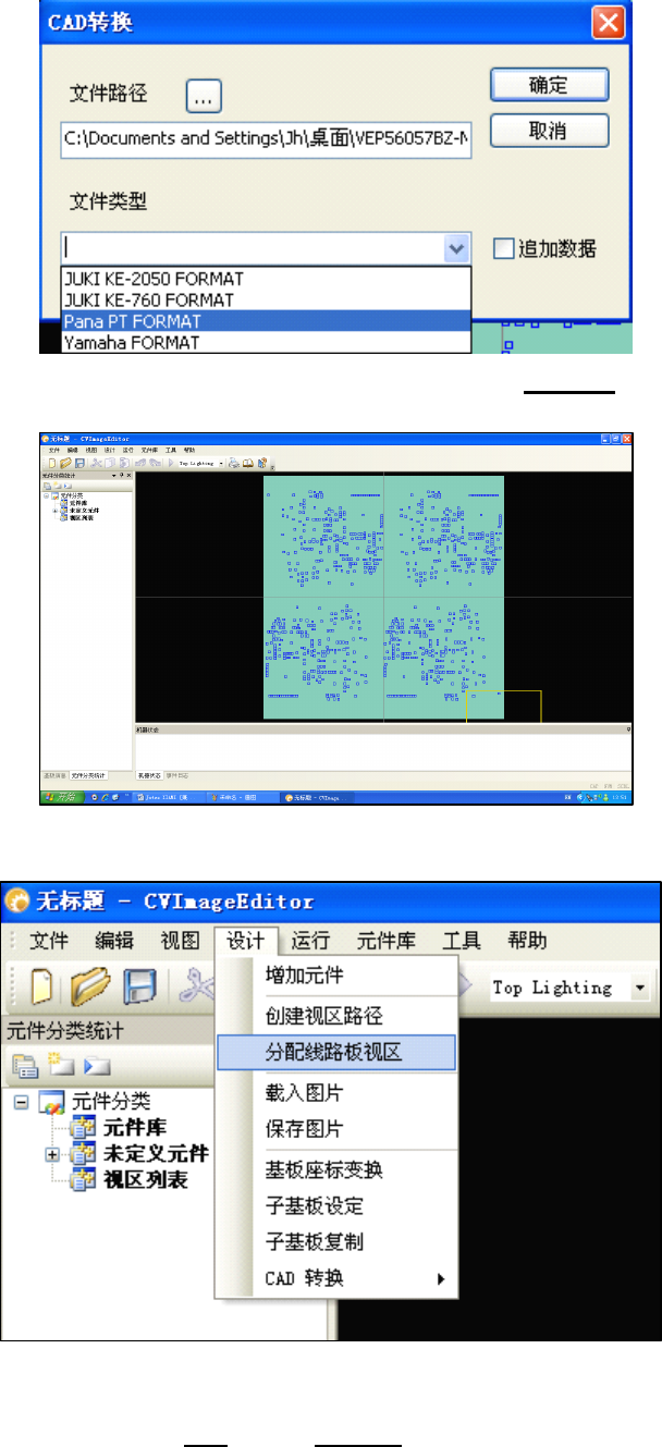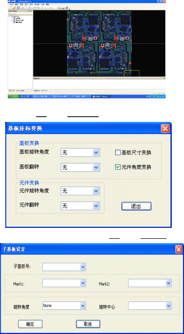 5 , 导入图像后 , 确认图像和 CAD 数据是否相吻合 , 如果元件或是基板需要作 角度 , 镜像 , 翻转 ;可以选择 设计 菜单栏下 基板坐标变换 6 , 需要对拼板 中其中一个进 行单板设定 ,可以选择 设计 菜单栏下 子基板设定