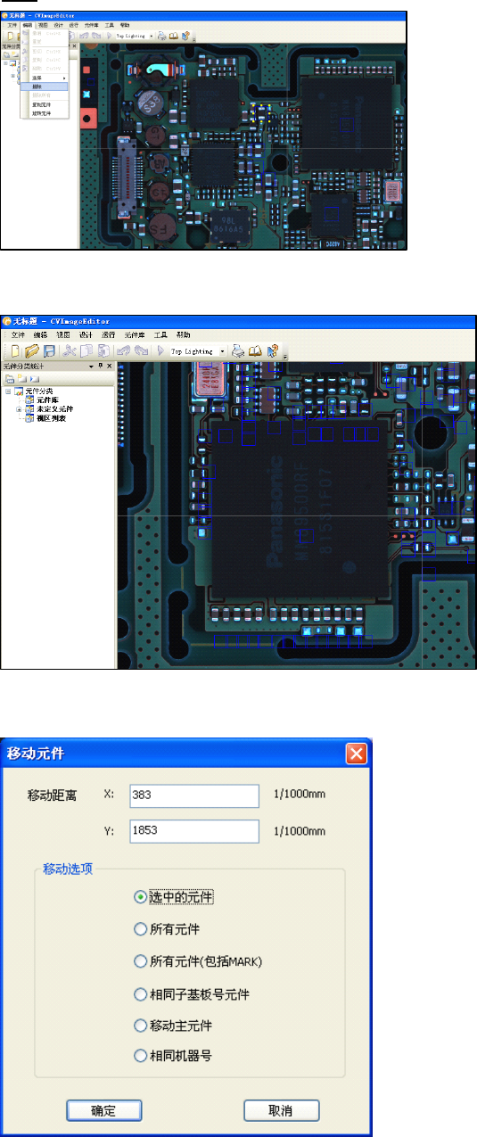 删除 完成数据删除 ( 3 ) C AD 数据移动, 数据移动前,注意观察蓝色窗口的位置; c ad 可以用鼠标左键激活元件拖动到指定位置,弹出移动元件对话窗口; 可以选择移动元件选项进行移动 数据移动后,注意观察和移动前的差异;所有 cad 和实际元件对齐