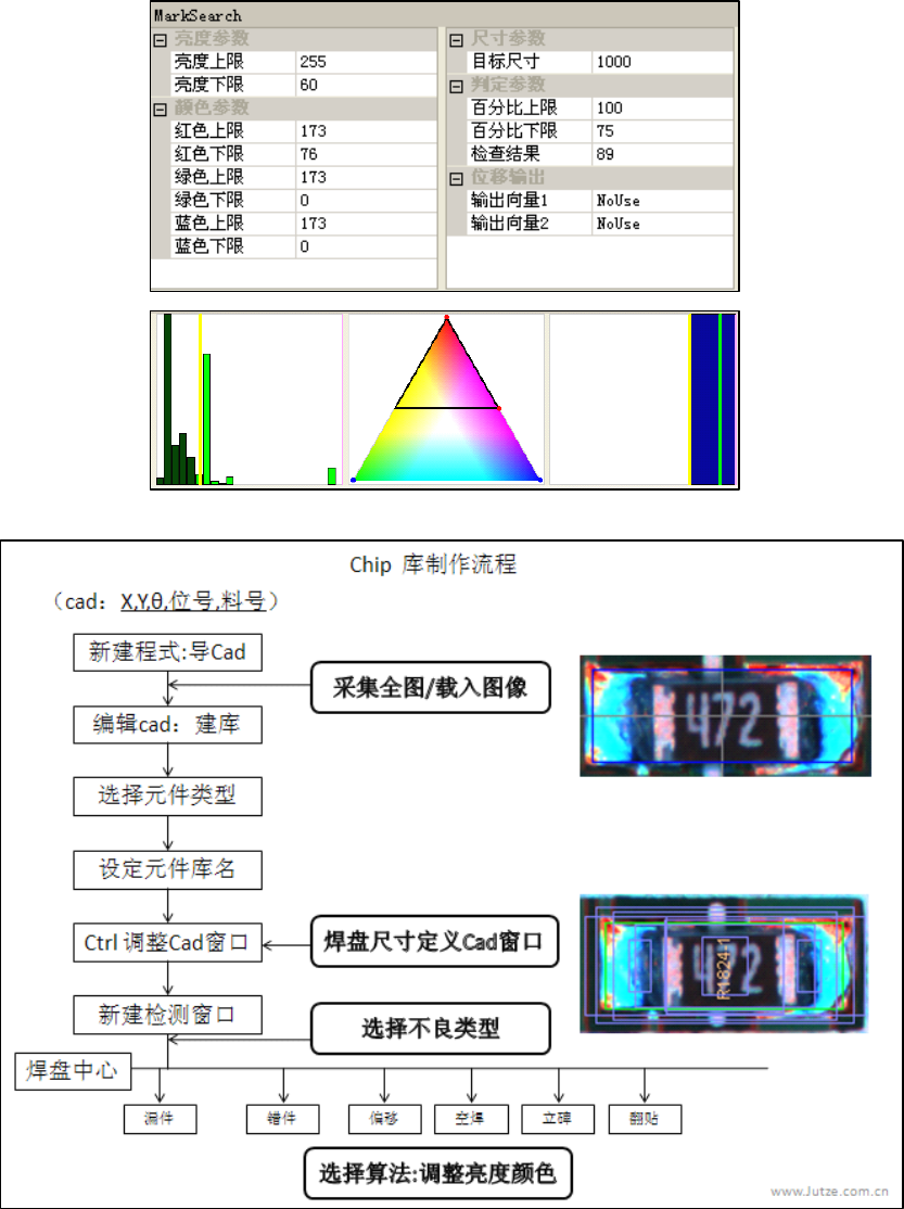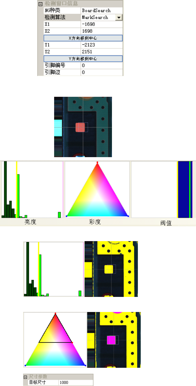 参数设定步骤 ○ 1 mark 原始图示和调试的参数种类(亮度 / 彩度) ○ 2 mark 特 征 一 : 亮 度 值 60 ( 实 际 检 测 过 程 中 需 少 许 调 试 ) ○ 3 mark 的尺寸设定: 1000 和 颜色样本抽取:红色