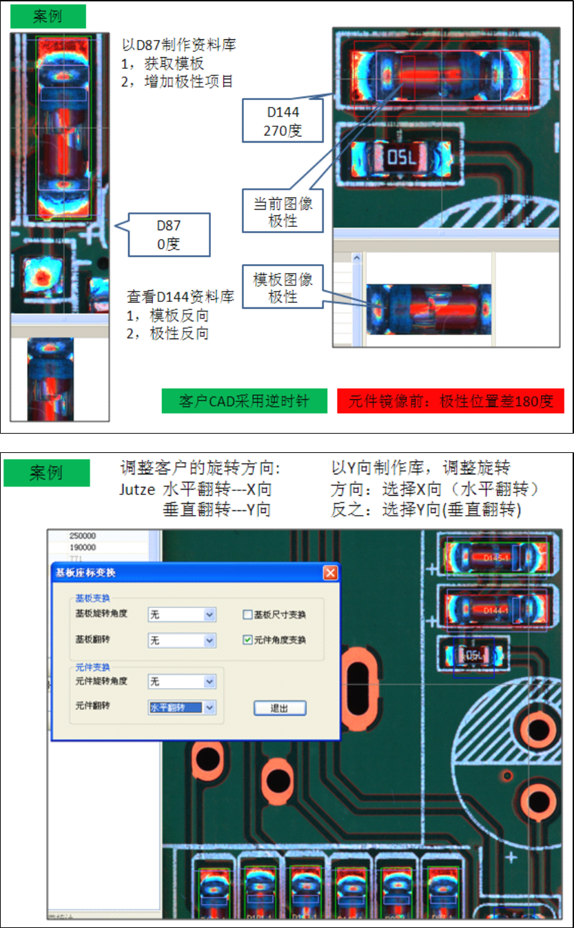 菜单 -- < 设计 >--< 基板坐标变换 > - - < 元件翻转 > :将库和 cad 的旋转方式统一 元件库制作窗口设定位置参考图示