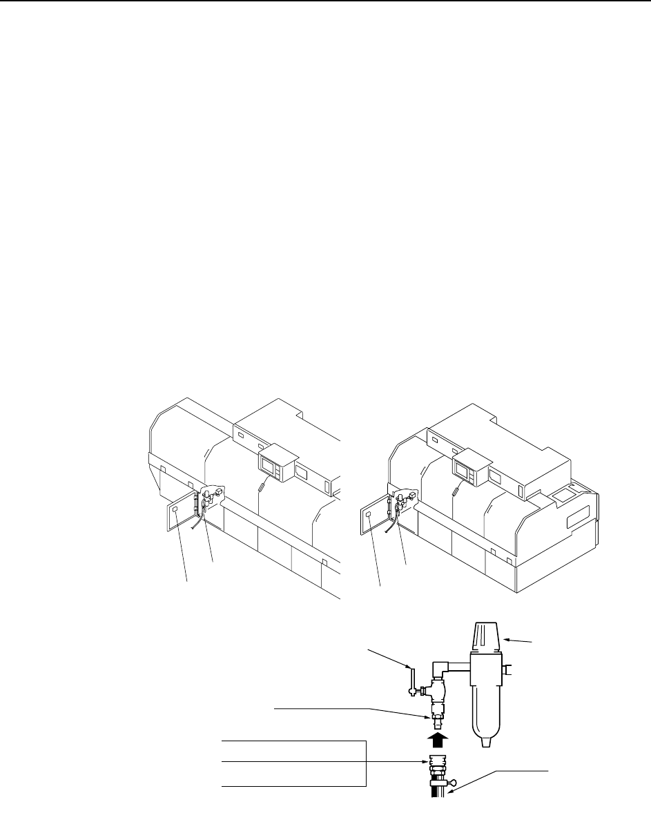 Setup >> Connecting the Air Supply MEC-CP842-1.0E 9-3 9.2 Connecting the Air Supply Point Connect the air hose to the m achine, and adjust the regulator to the prescribed air pressure. Procedure 1 Connect the air h…
