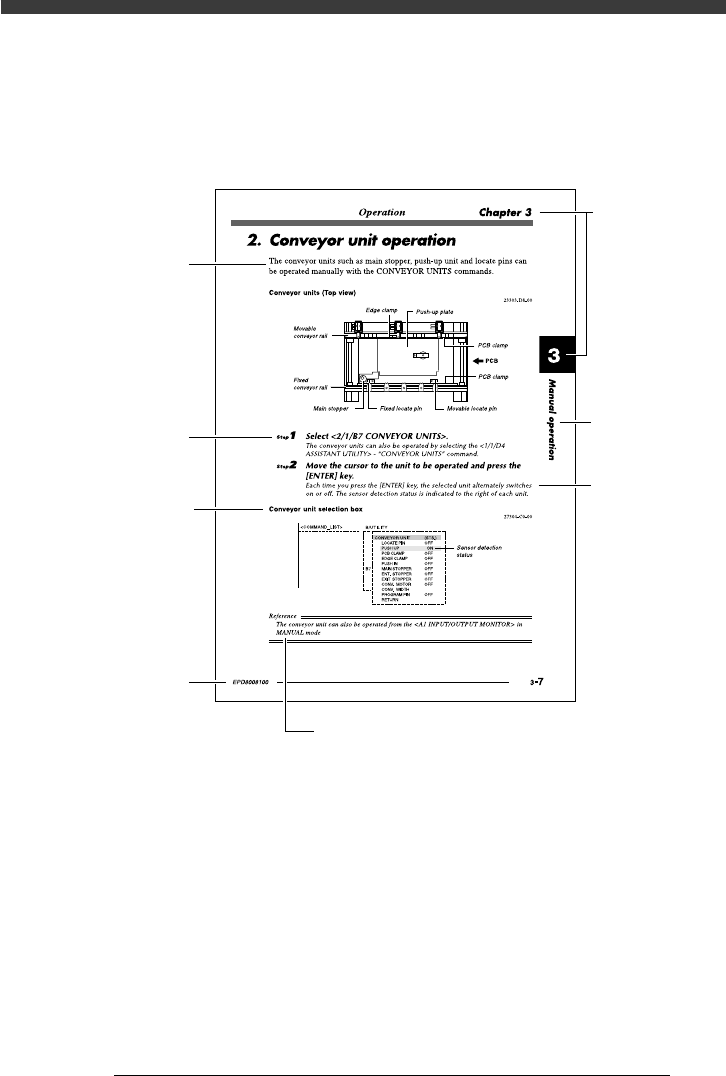 9 SED8013110 About this manual 3. Page layout The description below shows a typical page layout and helps you use this manual effecti vely . T ypical page layout 43002-D8-00 Step Manual No. Description Illustration or ta…