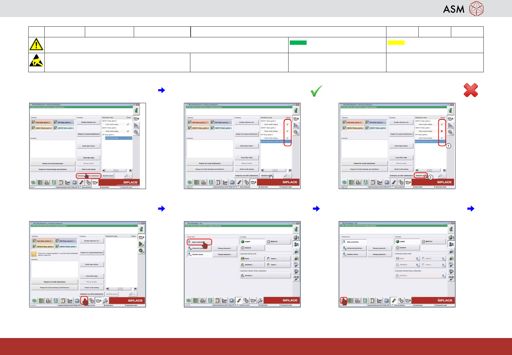 17 WF2 X_系列 S 耐久运行 5分钟 2 / 2 注 意 开 始 维 护 前 , 请 参 阅 用 户 手 册 中 的 安 全 说 明 贴片机状态开启 传送系统空 注意!遵守防静电守则 工具: 易损件: 耗材: www.asm-smt.com 7 解除阻挡两个轨道并点击“确定”。 8 点击“开始生产”。
