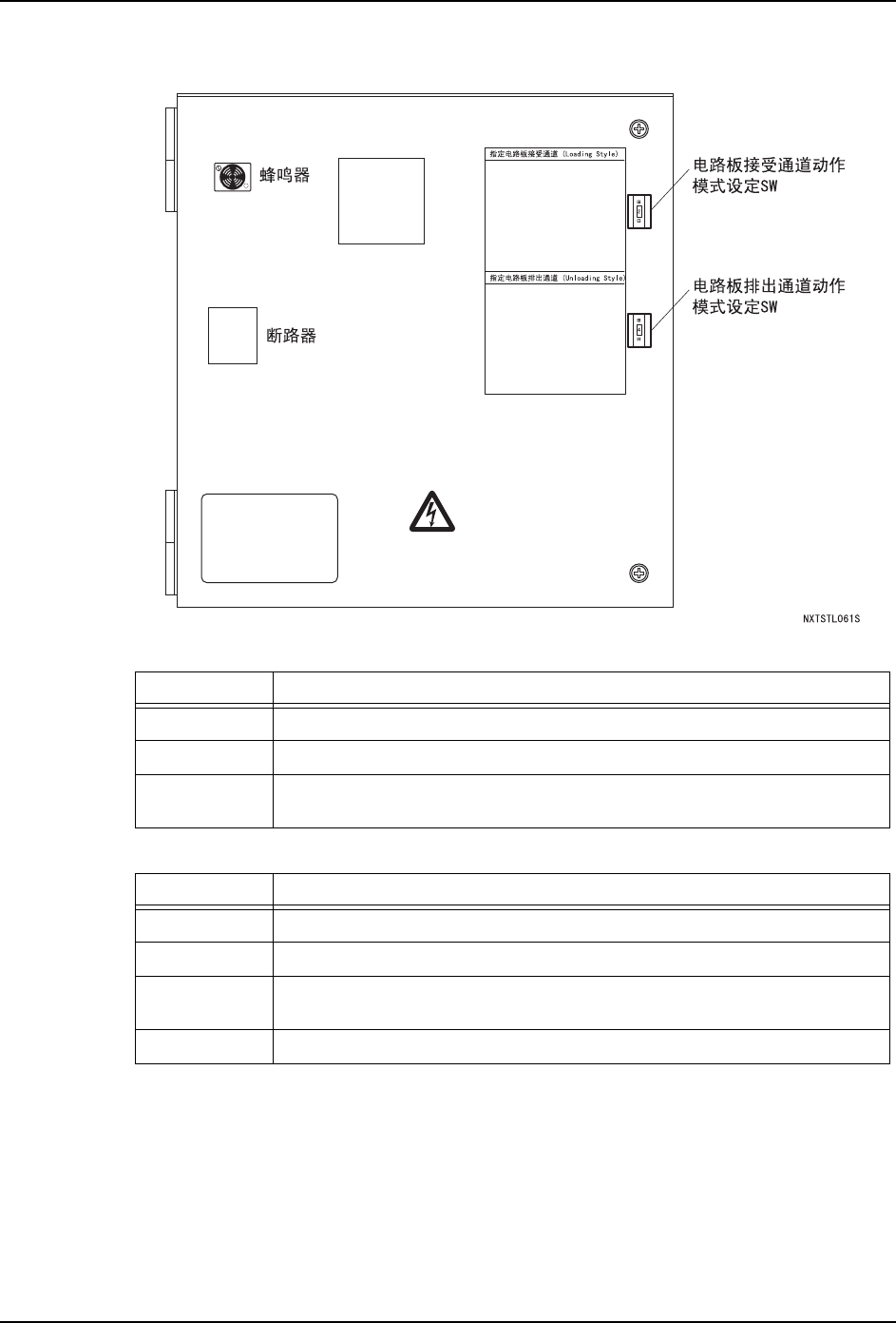4. 各部分的名称和功能 INS-NXTSTCBF-3.0S 20 NXT 往复臂搬运轨道 (自立型)使用说明书 4.3 控制箱 电路板接受通道 电路板排出通道 模式设定值 动作说明 1 仅仅从通道 1 接受电路板。 2 仅仅从通道 2 接受电路板。 3 从有前道工序的指示的通道接受 电路板。 通道 1、通道 2 双方有指示的时候,交替接受。 模式设定值 动作说明 1 仅仅向通道 1 排出电路板。 2 仅仅向通道 2 排出电路板。 3 …