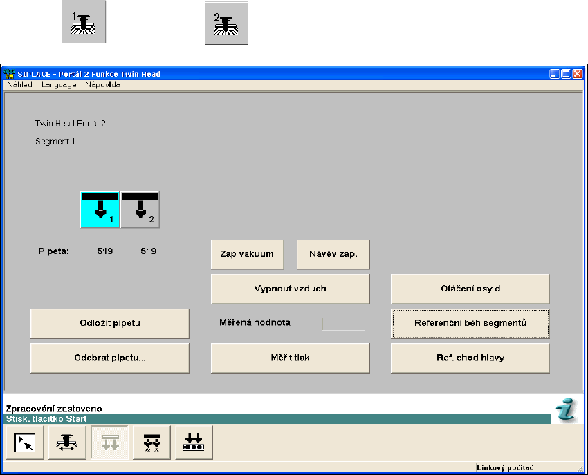 Funkce Twin Head, hodnoty stlačeného vzduchu Twin Head a konfigurace měniče pipet die Twin