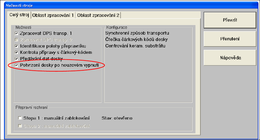 Je realizován nouzový provoz, který umožňuje vypnout jednu oblast osazování. Tato vypnutá