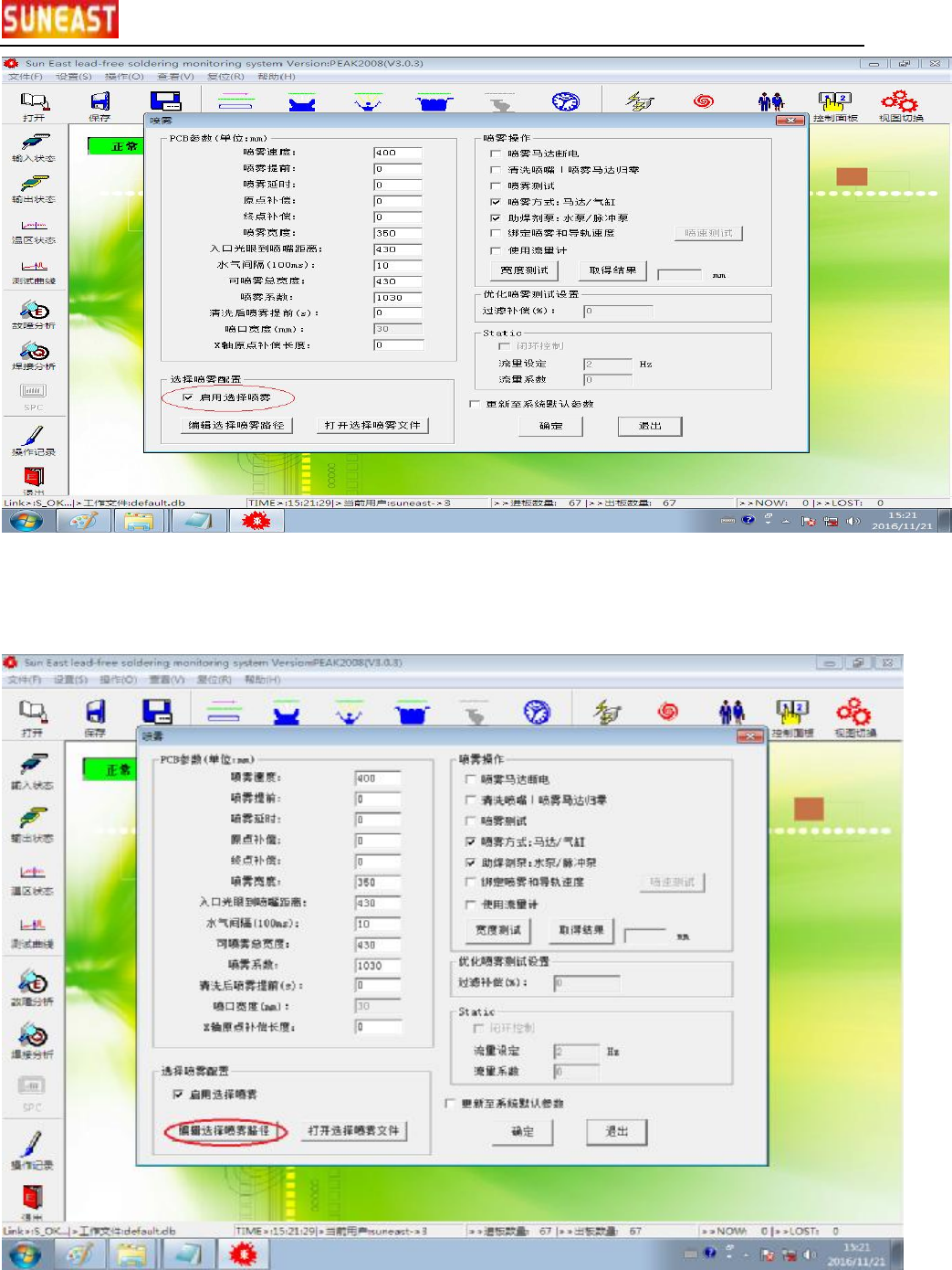 电 脑 波峰 焊 用 户 手册 60 / 7 3 D : 选择 喷雾 使 用 说明 ( 可 选 项, 仅 供 参 考 ) 一 、 新 建选 择喷雾 工 程 文 件 1 . 点 击 工 具 栏 的 “ 喷雾 设置 ” ,或 者 点 击 菜 单 栏 的 设置 再 点 击 【 喷雾 参数 】 。 ( 下 图 ) 2. 启 用 选择 性 喷雾 :将 【 启 用 选择 喷雾 】 打 钩 ( 下 图 ) 。 suneast production